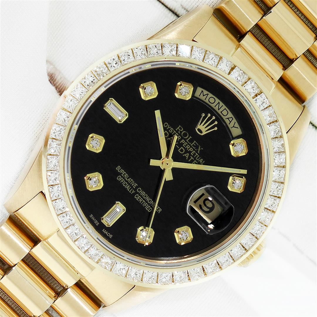 One Men's Rolex Day Date 18K Yellow Gold President Polished, Serviced & Electronically Tested, 18K Yellow Gold Case: 36mm, Rolex 18K Yellow Gold Crown, Custom Bezel: New 14K Yellow Gold Princess Cut Diamond Bezel, Diamond Count: 53 Diamonds On Bezel. Total Weight 2.75 Carat, Clarity: SI-VS, Color: G to H. Custom Crystal: New Sapphire with Magnified Date Window. Custom Hands: New Luminescent Hands. Rolex Movement: Automatic Winding Movement Caliber 3055. Custom Dial: Refinished To Black with Custom Added Diamond Hour Markers. Diamond Count: 8 Diamonds + 2 Diamond Baguettes, Color: G To H, Clarity: SI-VS. Date Window: 3 O'Clock Position Date Display, Day Window: 12 O'Clock Position Date Display. Quickset, Model: Day Date President. Condition: G-6 Extra Fine The Watch Is In Very Good Condition Free Of All Scratches And Dents. Rolex Bracelet: 18K Yellow Gold President. Bright Polish. 7.0 Inch Length, Standard Hidden President Clasp President Band, with Rolex Logo. This Preowned Watch Has Been Serviced And Polished It Is Free Of All Scratches And Dents.