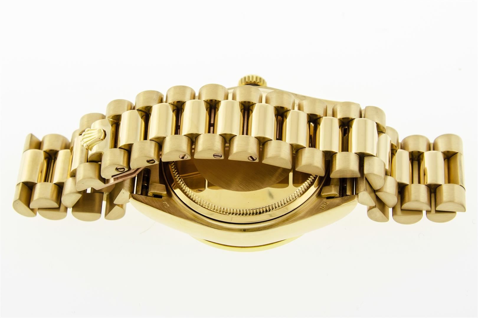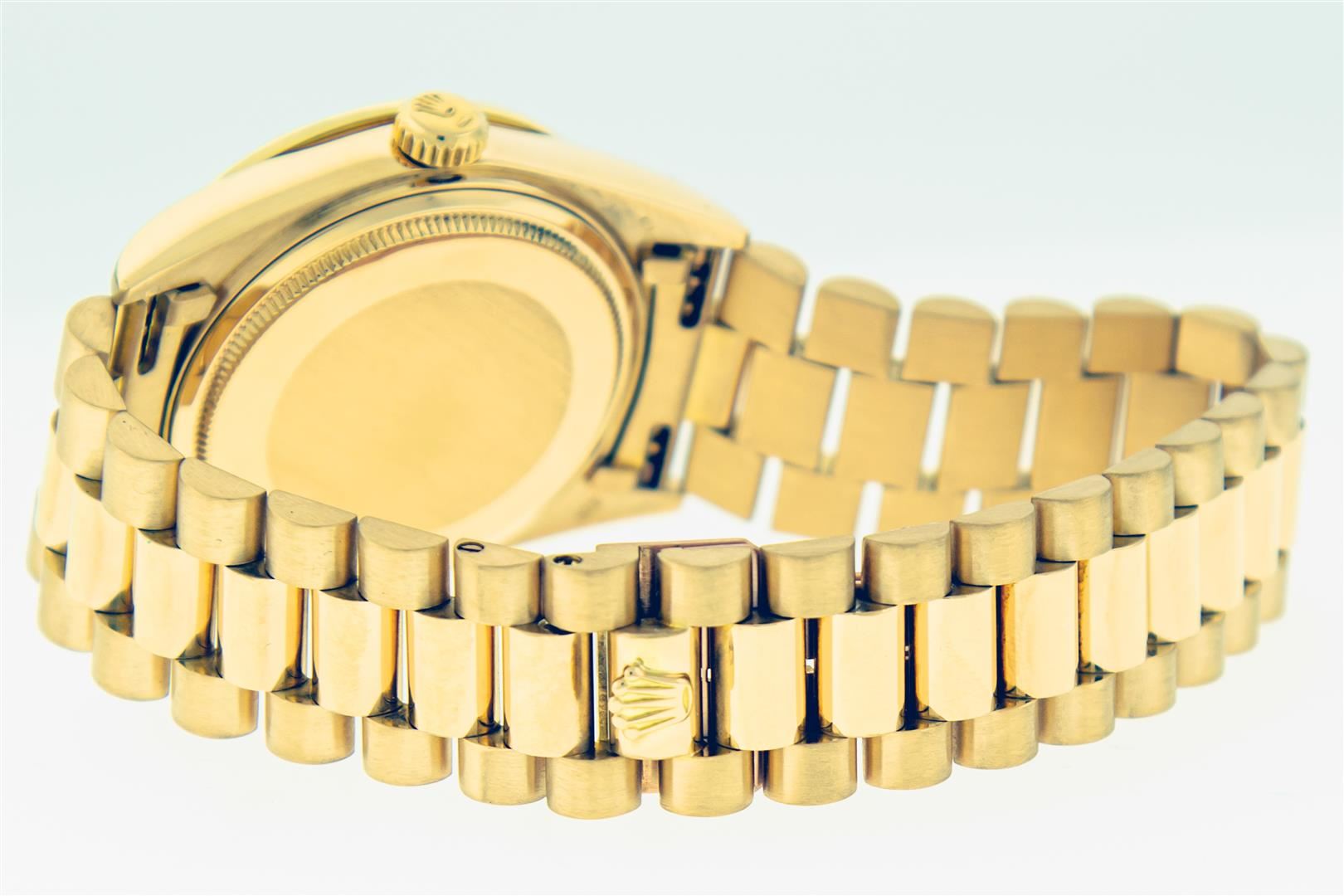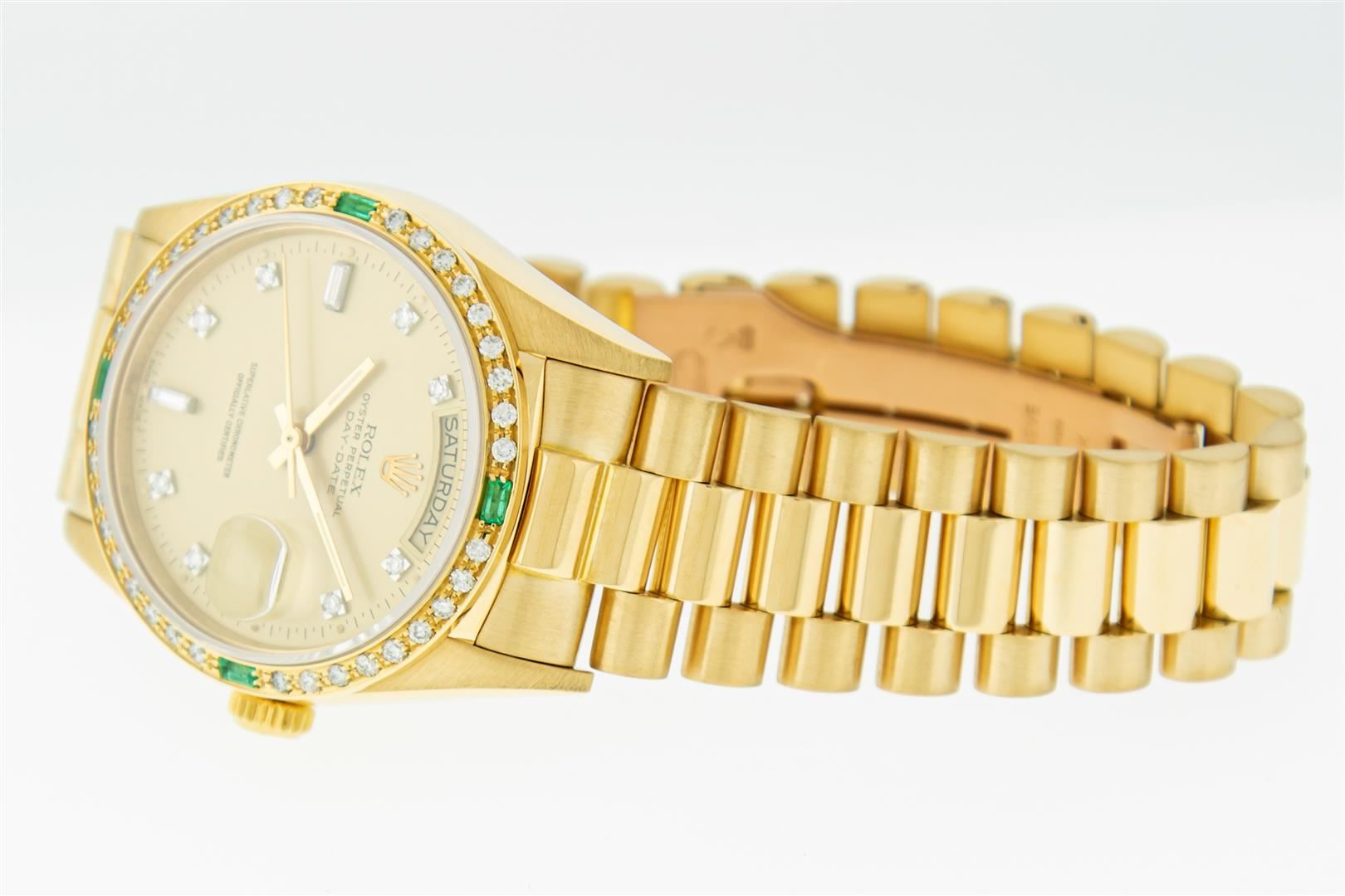 One Mens Rolex Day Date 18K Yellow Gold President Polished, Serviced & Electronically Tested, Rolex 18K Yellow Gold Case: 36mm, Rolex 18K Yellow Gold Crown, Custom Bezel: Custom Bezel: New 18K Yellow Gold Diamond Bezel + Emerald, Diamond Count 36 Diamonds + 4 Emeralds On Bezel, Clarity: SI-VS, Color: G to H. Custom Crystal: New Sapphire With Magnified Date Window. Custom Hands: New Luminescent Hands. Rolex Movement: Automatic Winding Movement Caliber 3055. Rolex Dial: Factory Champagne Diamond Dial, Diamond Count: 8 Diamonds + 2 Baguettes, Clarity: VS. Date Window: 3 O'Clock Position Date Display, Day Window: 12 O'Clock Position Date Display. Quickset, Model: Day Date President. Condition: G-6 Extra Fine. Rolex Bracelet: New 18K Yellow Gold President Band. Bright Polish. 7.0 Inch Length, Standard Hidden President Clasp President Band, With Rolex Logo. This Pre Owned Watch Has Been Serviced And Polished It Is Free Of All Scratches And Dents. This Watch Comes With A Rolex Box.