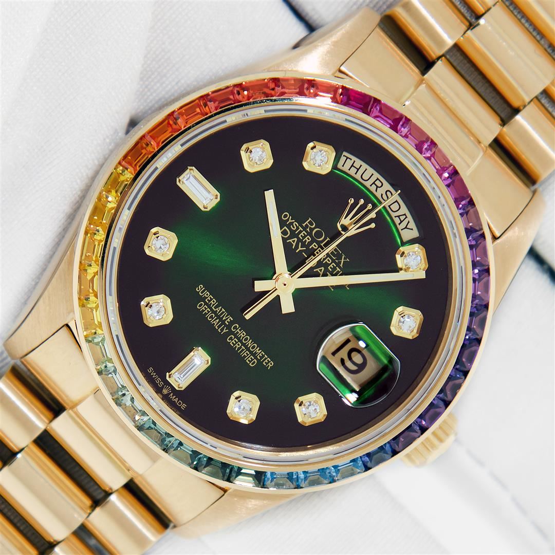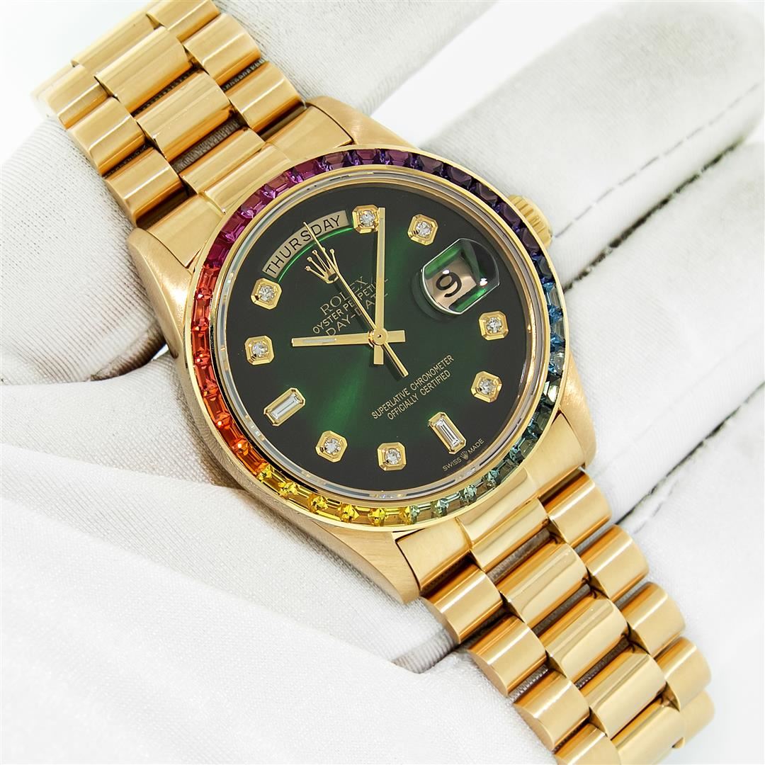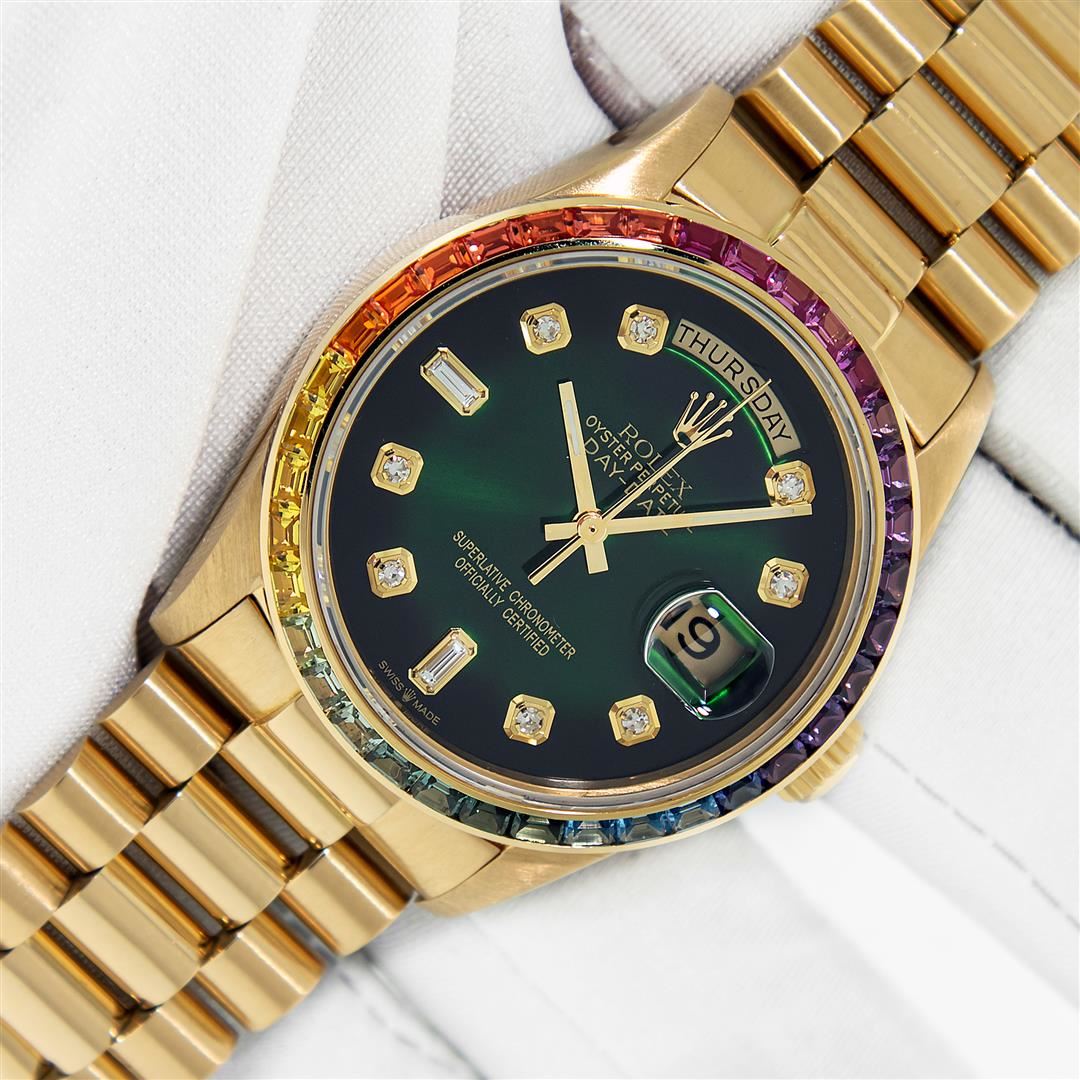 One Men's Pre Owned Rolex Day Date 18K Yellow Gold President Polished, Serviced & Electronically Tested, Rolex 18K Yellow Gold Case: 36mm, Rolex 18K Yellow Gold Crown, Custom Bezel: New 18K Yellow Gold Synthetic Stone Bezel. Custom Crystal: New Sapphire with Date Window. Custom Hands: New Luminescent Hands. Rolex Movement: Automatic Winding Movement Caliber 3055. Custom Dial: Refinished To Green with Added Diamonds On Dial, Diamond Count: 8 Diamonds + 2 Baguettes, Color: G to H, Clarity: VS. Date Window: 3 O'Clock Position Date Display, Day Window: 12 O'Clock Position Date Display. Quickset, Model: Day Date President. Condition: G-6 Extra Fine The Watch Is In Very Good Condition Free Of All Scratches And Dents. Rolex Bracelet: 18K Yellow Gold President Band. Bright Polish. 7.0 Inch Length, Standard Hidden President Clasp President Band, with Rolex Logo.