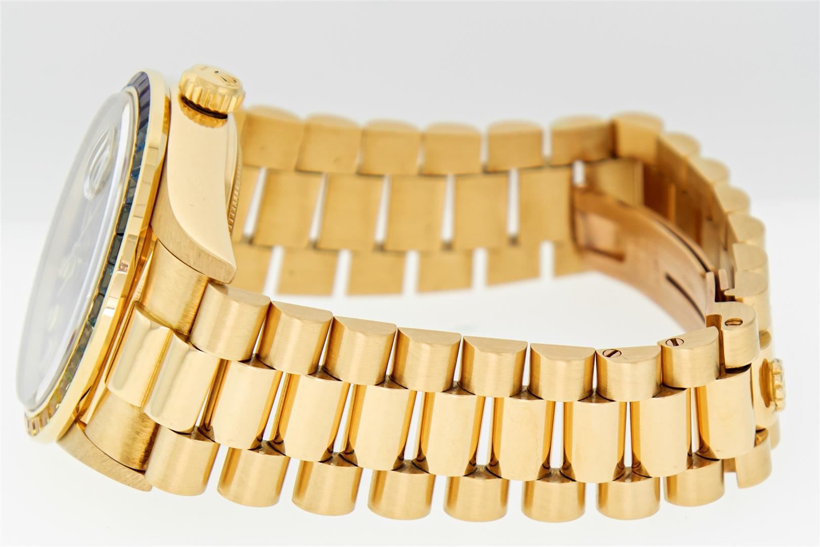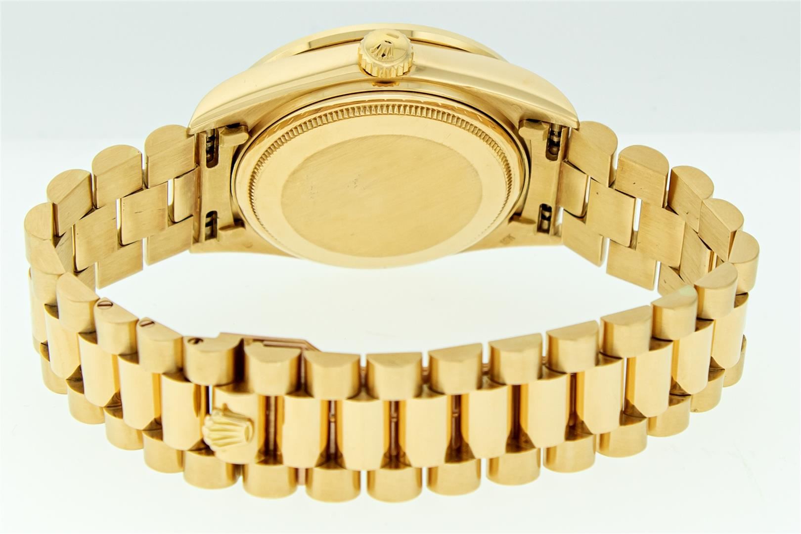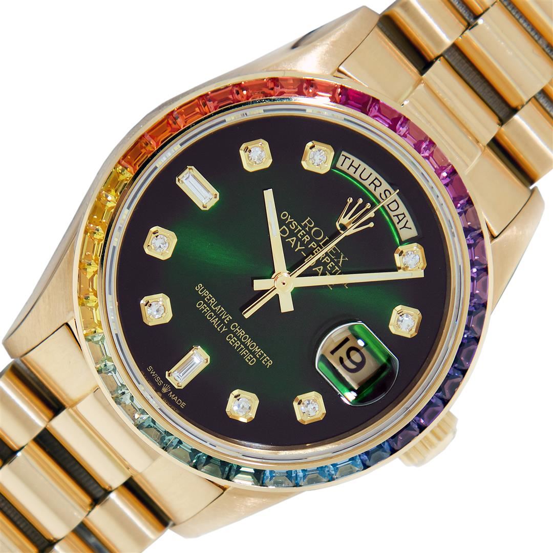 One Men's Pre Owned Rolex Day Date 18K Yellow Gold President Polished, Serviced & Electronically Tested, Rolex 18K Yellow Gold Case: 36mm, Rolex 18K Yellow Gold Crown, Custom Bezel: New 18K Yellow Gold Synthetic Stone Bezel. Custom Crystal: New Sapphire with Date Window. Custom Hands: New Luminescent Hands. Rolex Movement: Automatic Winding Movement Caliber 3055. Custom Dial: Refinished To Green with Added Diamonds On Dial, Diamond Count: 8 Diamonds + 2 Baguettes, Color: G to H, Clarity: VS. Date Window: 3 O'Clock Position Date Display, Day Window: 12 O'Clock Position Date Display. Quickset, Model: Day Date President. Condition: G-6 Extra Fine The Watch Is In Very Good Condition Free Of All Scratches And Dents. Rolex Bracelet: 18K Yellow Gold President Band. Bright Polish. 7.0 Inch Length, Standard Hidden President Clasp President Band, with Rolex Logo.