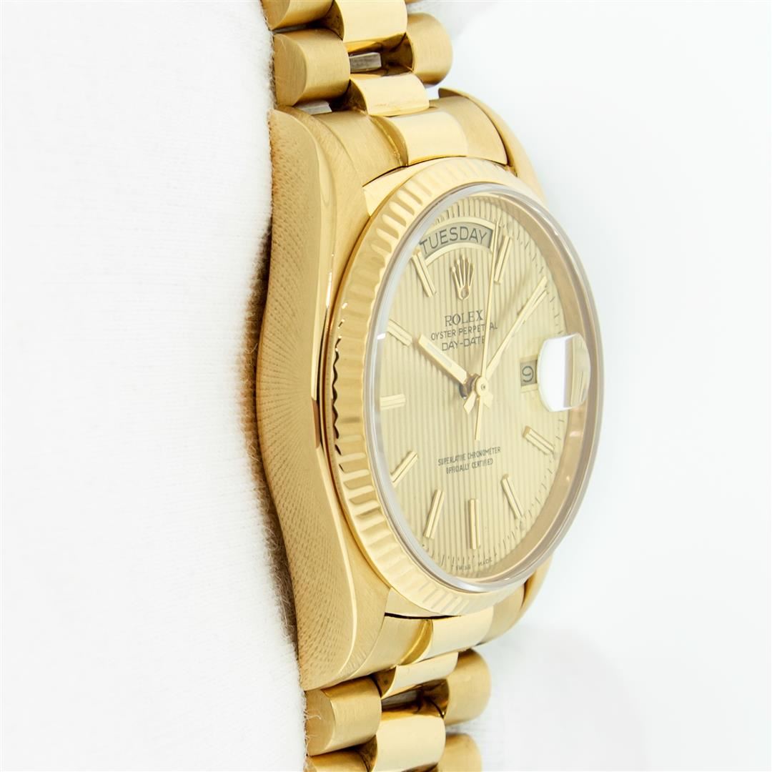 One Men's Pre Owned Quickset Rolex Day Date 18K Yellow Gold President Polished, Serviced & Electronically Tested, Rolex 18K Yellow Gold Case: 36mm, Rolex 18K Yellow Gold Crown, Rolex Bezel: 18K Yellow Gold Fluted Bezel. Crystal: Sapphire With Cyclops Lens. Rolex Movement: Automatic Quickset Winding Movement Caliber 3055. Rolex Dial: Factory Champagne Tapestry Index Dial. Date Window: 3 O'Clock Position, Day Display: 12 O'Clock Position, Single Quickset, Model: Day Date President. Condition: G-6 Extra Fine. Rolex Bracelet: 18K Yellow Gold President Band With Hidden Clasp, Bright & Satin Polish. 7.0 Inch Length, Standard President Clasp, With Rolex Logo. This Watch Comes With A Rolex Box & Booklet.
