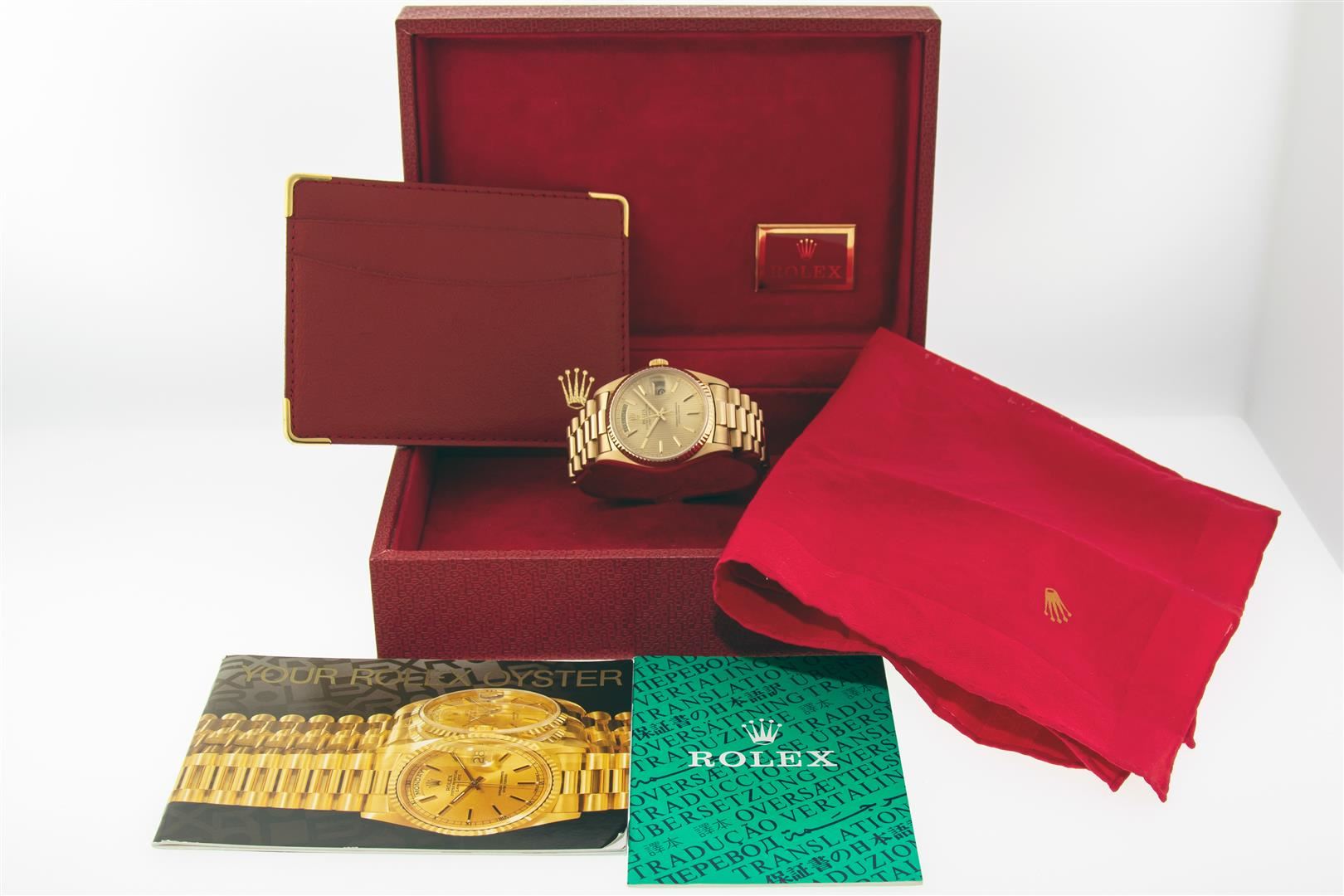 One Men's Pre Owned Quickset Rolex Day Date 18K Yellow Gold President Polished, Serviced & Electronically Tested, Rolex 18K Yellow Gold Case: 36mm, Rolex 18K Yellow Gold Crown, Rolex Bezel: 18K Yellow Gold Fluted Bezel. Crystal: Sapphire With Cyclops Lens. Rolex Movement: Automatic Quickset Winding Movement Caliber 3055. Rolex Dial: Factory Champagne Tapestry Index Dial. Date Window: 3 O'Clock Position, Day Display: 12 O'Clock Position, Single Quickset, Model: Day Date President. Condition: G-6 Extra Fine. Rolex Bracelet: 18K Yellow Gold President Band With Hidden Clasp, Bright & Satin Polish. 7.0 Inch Length, Standard President Clasp, With Rolex Logo. This Watch Comes With A Rolex Box & Booklet.