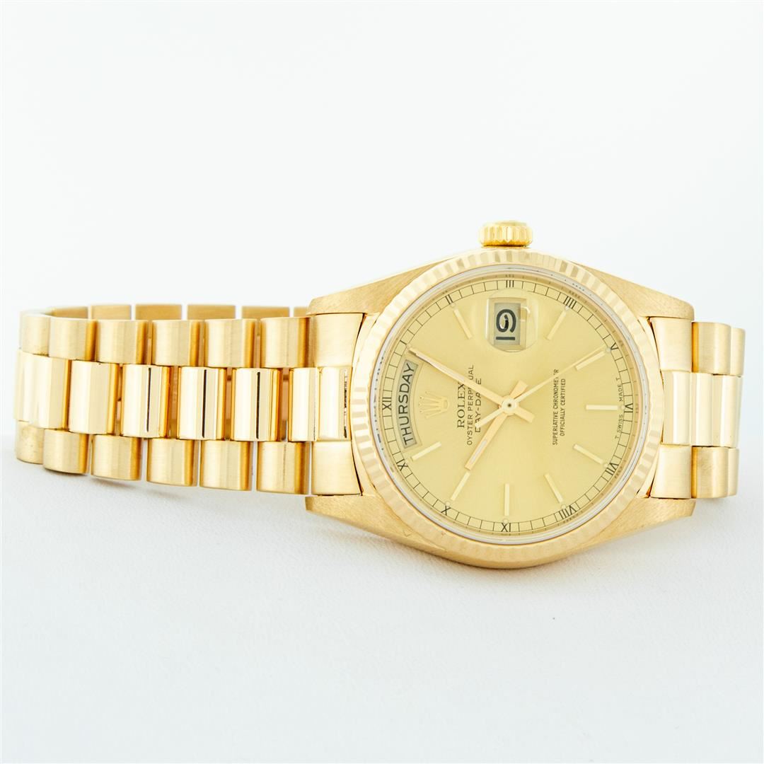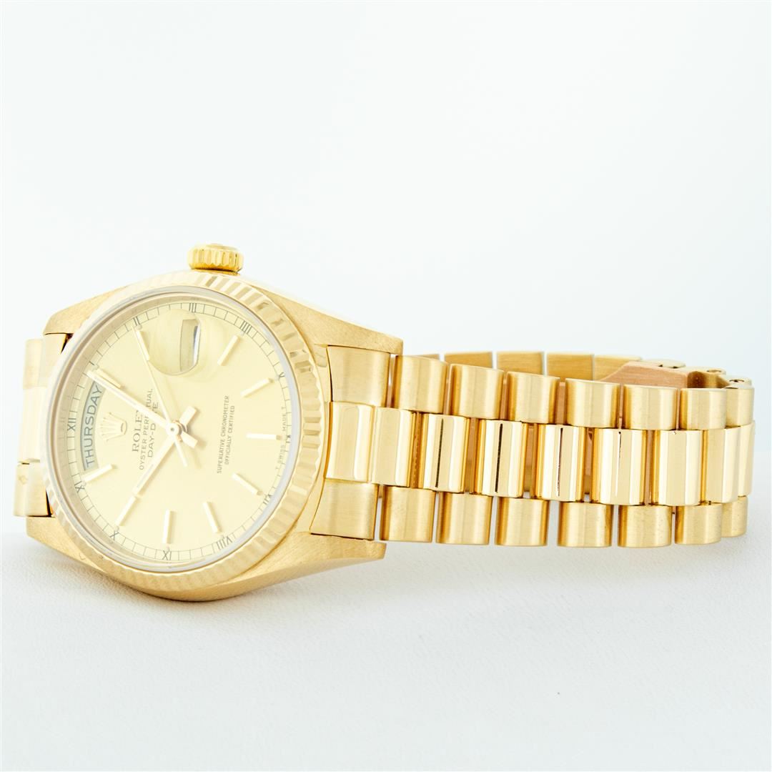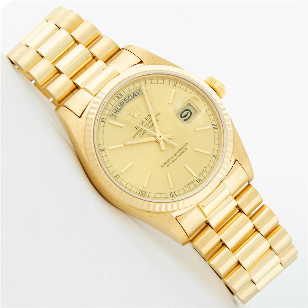 One Men's Pre Owned Quickset Rolex Day Date 18K Yellow Gold President Polished, Serviced & Electronically Tested, Rolex 18K Yellow Gold Case: 36mm, Rolex 18K Yellow Gold Crown, Rolex Bezel: 18K Yellow Gold Fluted Bezel. Custom Crystal: New Scratch Resistant Synthetic Sapphire Cyclops Lens. Rolex Movement: Automatic Quickset Winding Movement Caliber 3055. Rolex Dial: Champagne Index With Roman Track & Lumi Dots. Date Window: 3 O'Clock Position, Day Display: 12 O'Clock Position, Single Quickset, Model: Day Date President. Condition: G-6 Extra Fine. Rolex Bracelet: 18K Yellow Gold President Band With Hidden Clasp, Bright & Satin Polish. 7.0 Inch Length, Standard President Clasp, With Rolex Logo. This Watch Comes With A Rolex Box.