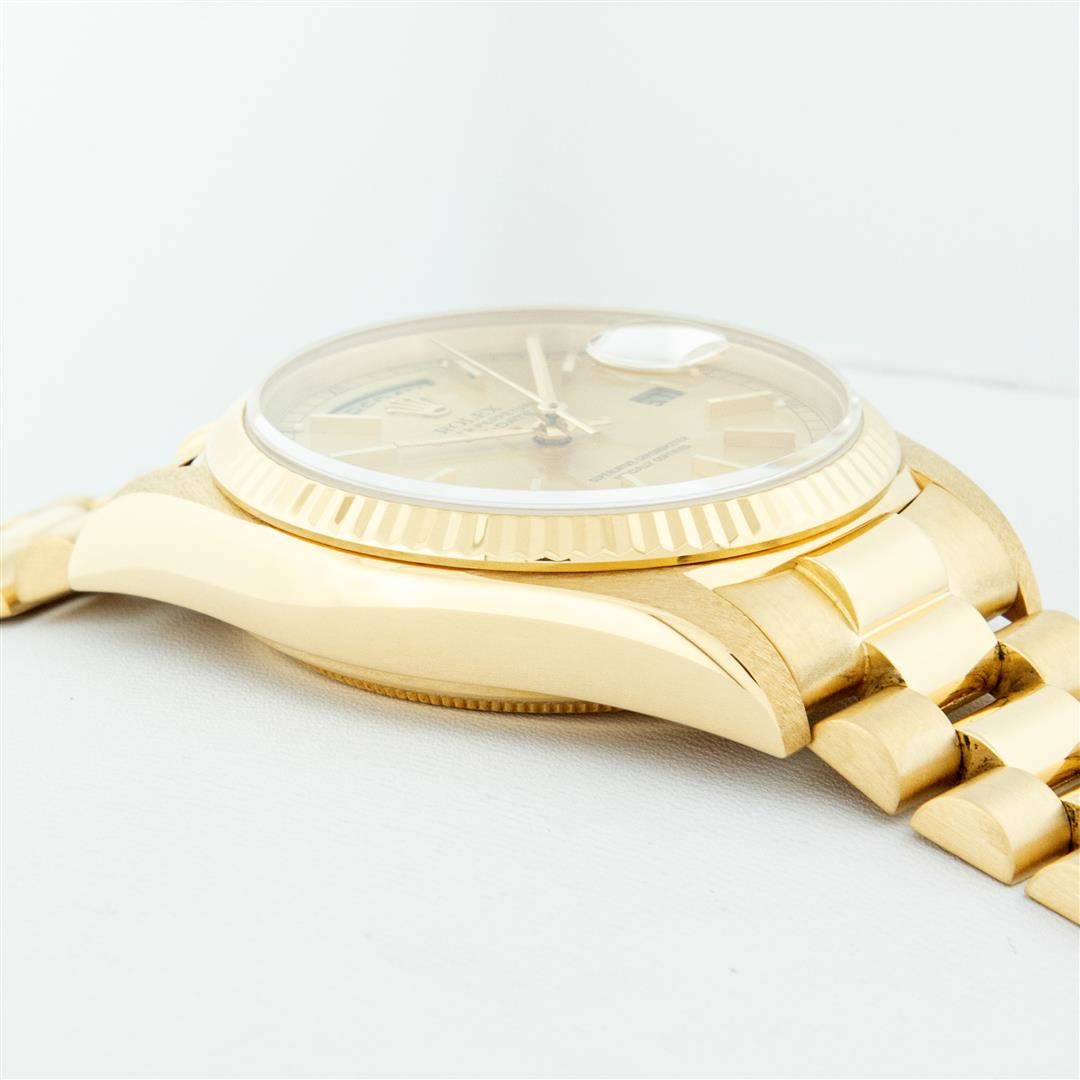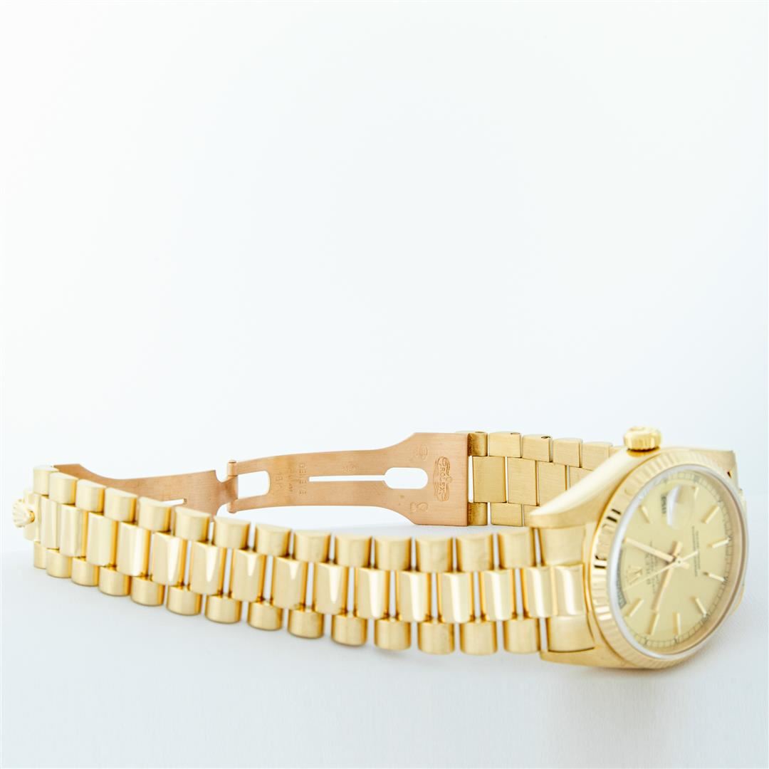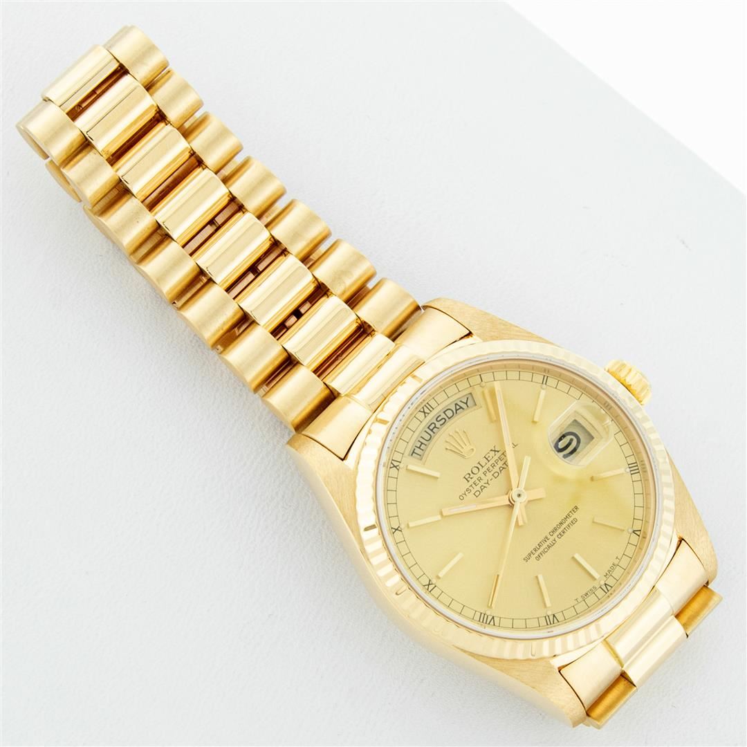 One Men's Pre Owned Quickset Rolex Day Date 18K Yellow Gold President Polished, Serviced & Electronically Tested, Rolex 18K Yellow Gold Case: 36mm, Rolex 18K Yellow Gold Crown, Rolex Bezel: 18K Yellow Gold Fluted Bezel. Custom Crystal: New Scratch Resistant Synthetic Sapphire Cyclops Lens. Rolex Movement: Automatic Quickset Winding Movement Caliber 3055. Rolex Dial: Champagne Index With Roman Track & Lumi Dots. Date Window: 3 O'Clock Position, Day Display: 12 O'Clock Position, Single Quickset, Model: Day Date President. Condition: G-6 Extra Fine. Rolex Bracelet: 18K Yellow Gold President Band With Hidden Clasp, Bright & Satin Polish. 7.0 Inch Length, Standard President Clasp, With Rolex Logo. This Watch Comes With A Rolex Box.