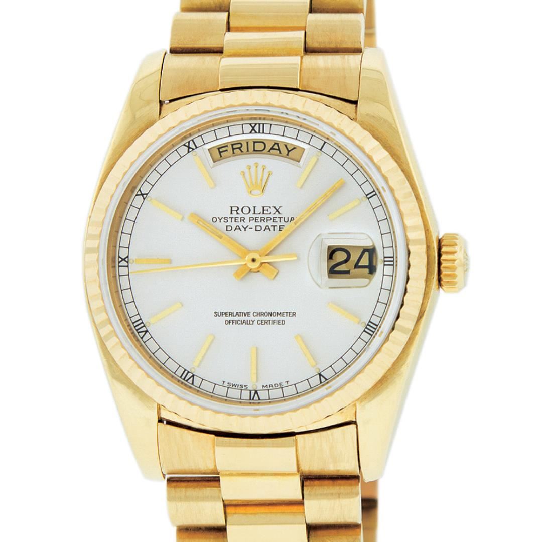 One Men's Quickset Rolex Day Date 18K Yellow Gold President Polished, Serviced & Electronically Tested, Rolex 18K Yellow Gold Case: 36mm, Rolex 18K Yellow Gold Crown, Rolex Bezel: 18K Yellow Gold Fluted Bezel. Crystal: Sapphire With Magnified Date Window. Hands: Luminescent Hands. Rolex Movement: Automatic Quickset Winding Movement Caliber 3055. Rolex Dial: Champagne Index With Roman Track & Lumi Dots. Date Window: 3 O'Clock Position, Day Display: 12 O'Clock Position, Single Quickset, Model: Day Date Quickset President. Condition: G-6 Extra Fine. Rolex Bracelet: 18K Yellow Gold President Band With Hidden Clasp, Bright & Satin Polish. 7.0 Inch Length, Standard Hidden President Clasp, With Rolex Logo. This Pre Owned Watch Has Been Serviced Time Tested And Is In Excellent Condition It Is Free Of All Scratches And Dents.