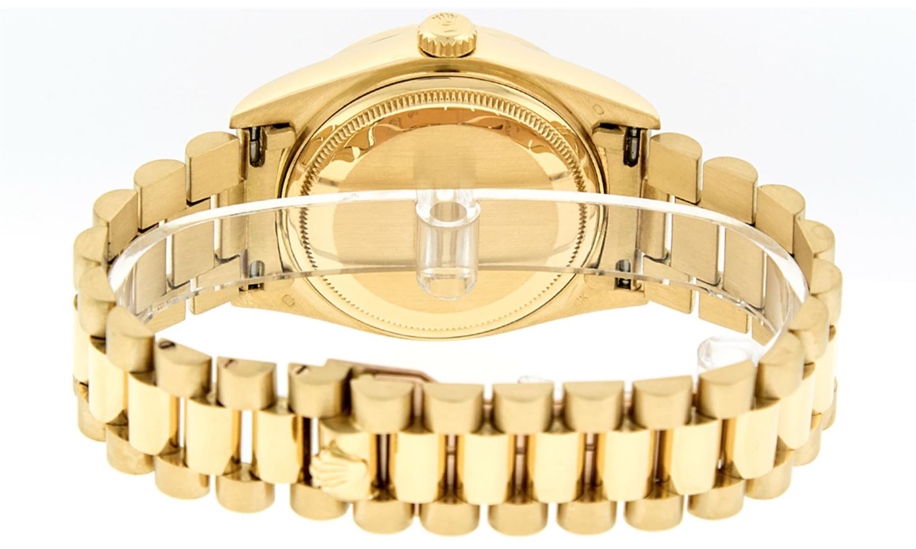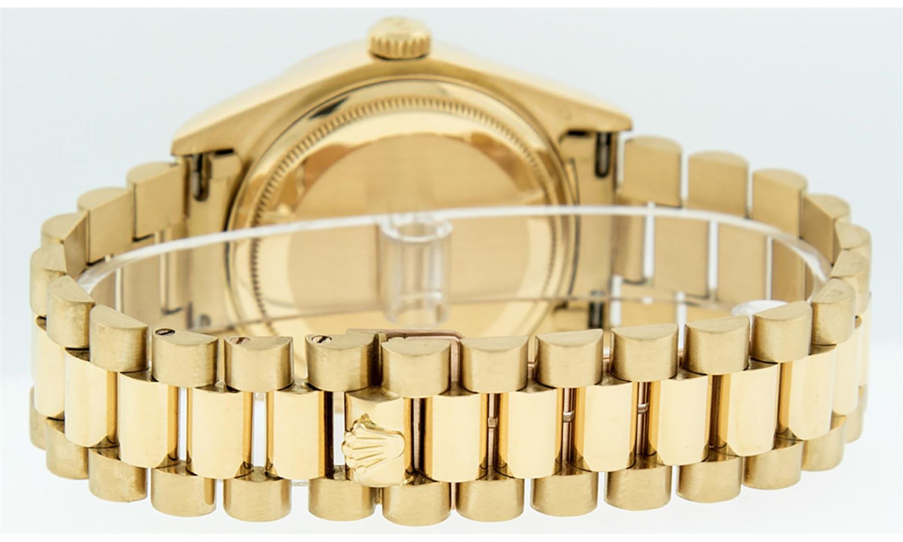 One Men's Quickset Rolex Day Date 18K Yellow Gold President Polished, Serviced & Electronically Tested, Rolex 18K Yellow Gold Case: 36mm, Rolex 18K Yellow Gold Crown, Rolex Bezel: 18K Yellow Gold Fluted Bezel. Crystal: Sapphire With Magnified Date Window. Hands: Luminescent Hands. Rolex Movement: Automatic Quickset Winding Movement Caliber 3055. Rolex Dial: Champagne Index With Roman Track & Lumi Dots. Date Window: 3 O'Clock Position, Day Display: 12 O'Clock Position, Single Quickset, Model: Day Date Quickset President. Condition: G-6 Extra Fine. Rolex Bracelet: 18K Yellow Gold President Band With Hidden Clasp, Bright & Satin Polish. 7.0 Inch Length, Standard Hidden President Clasp, With Rolex Logo. This Pre Owned Watch Has Been Serviced Time Tested And Is In Excellent Condition It Is Free Of All Scratches And Dents.