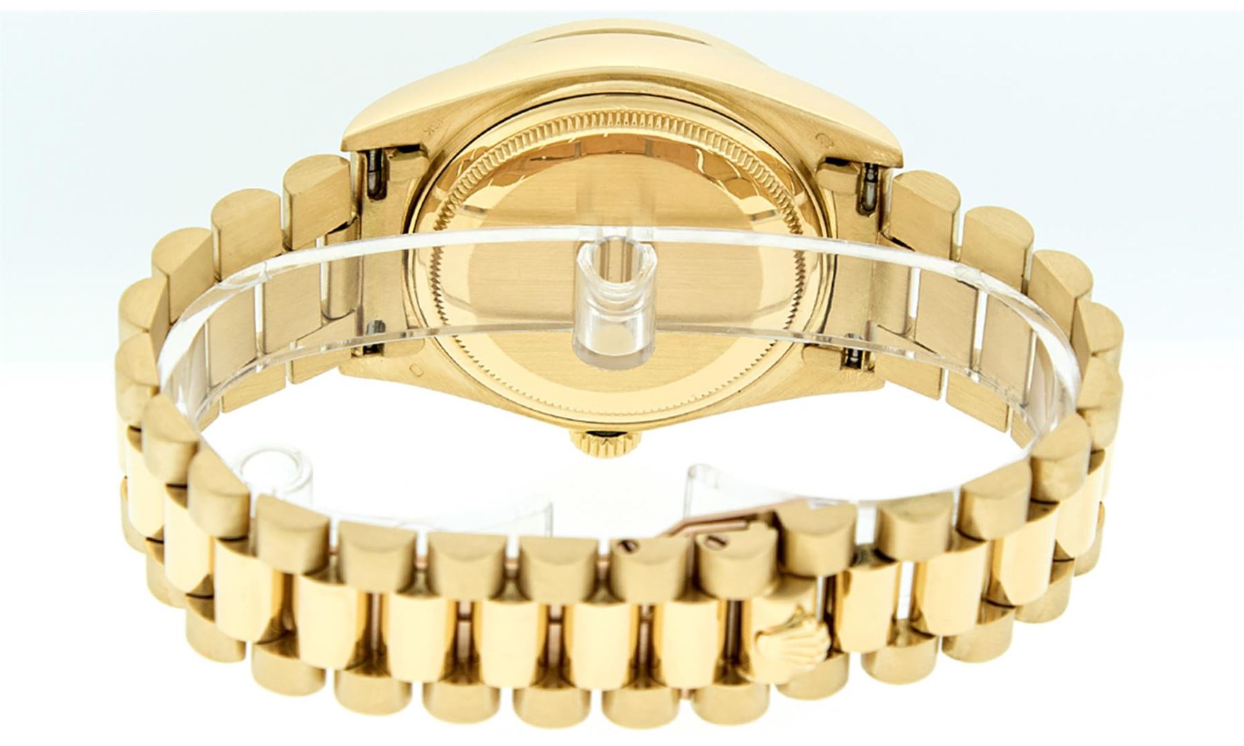One Men's Quickset Rolex Day Date 18K Yellow Gold President Polished, Serviced & Electronically Tested, Rolex 18K Yellow Gold Case: 36mm, Rolex 18K Yellow Gold Crown, Rolex Bezel: 18K Yellow Gold Fluted Bezel. Crystal: Sapphire With Magnified Date Window. Hands: Luminescent Hands. Rolex Movement: Automatic Quickset Winding Movement Caliber 3055. Rolex Dial: Champagne Index With Roman Track & Lumi Dots. Date Window: 3 O'Clock Position, Day Display: 12 O'Clock Position, Single Quickset, Model: Day Date Quickset President. Condition: G-6 Extra Fine. Rolex Bracelet: 18K Yellow Gold President Band With Hidden Clasp, Bright & Satin Polish. 7.0 Inch Length, Standard Hidden President Clasp, With Rolex Logo. This Pre Owned Watch Has Been Serviced Time Tested And Is In Excellent Condition It Is Free Of All Scratches And Dents.