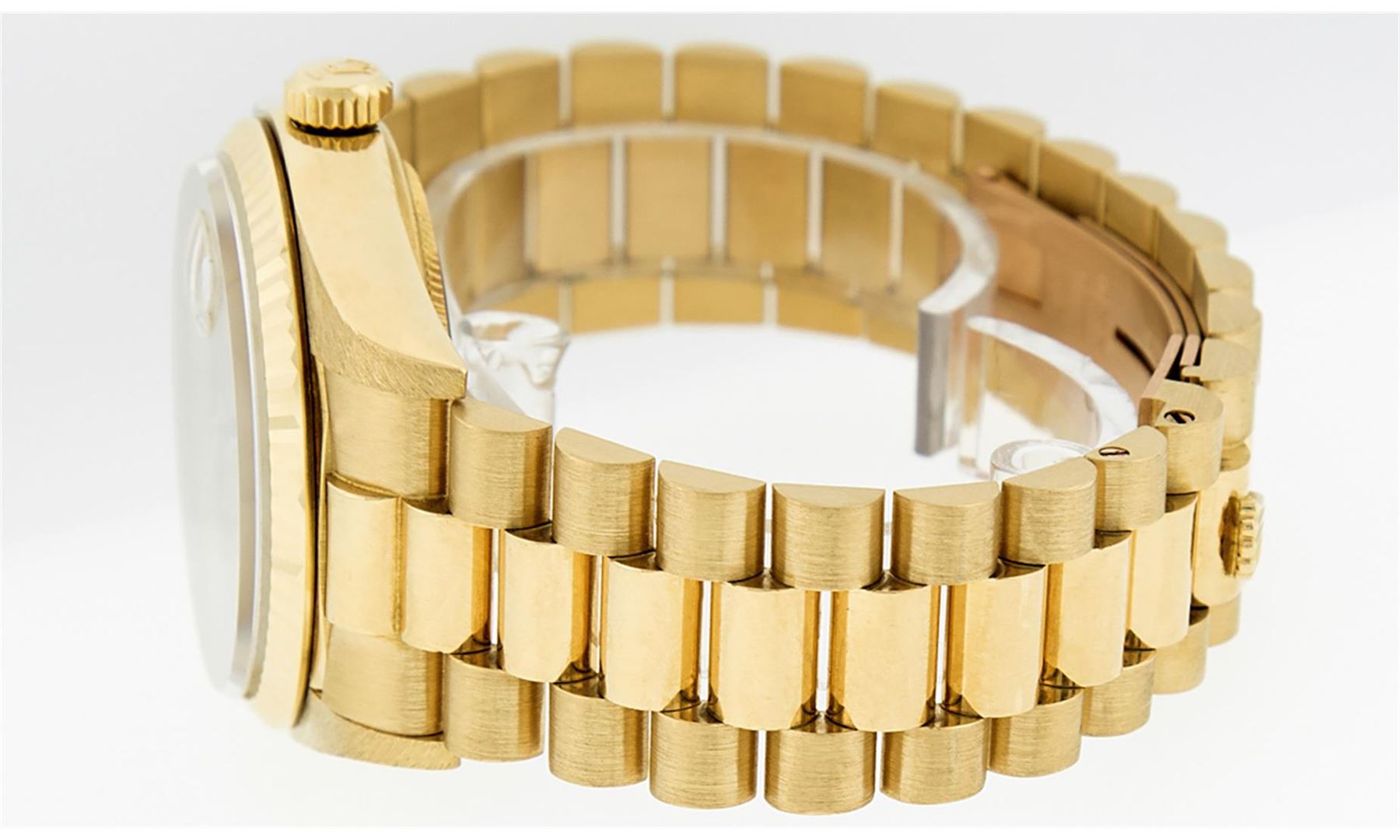One Men's Pre Owned Quickset Rolex Day Date 18K Yellow Gold President Polished, Serviced & Electronically Tested, Rolex 18K Yellow Gold Case: 36mm, Rolex 18K Yellow Gold Crown, Rolex Bezel: 18K Yellow Gold Fluted Bezel. Rolex Crystal: New Scratch Resistant Synthetic Sapphire Cyclops Lens. Custom Hands: New Luminescent Hands. Rolex Movement: Automatic Quickset Winding Movement Caliber 3055. Custom Dial: Refinished To Black With Custom Added Single Cut Diamonds. Date Window: 3 O'Clock Position, Day Display: 12 O'Clock Position, Single Quickset, Model: Day Date President. Condition: G-6 Extra Fine. Rolex Bracelet: 18K Yellow Gold President Band With Hidden Clasp, Bright & Satin Polish. 7.0 Inch Length, Standard President Clasp, With Rolex Logo.