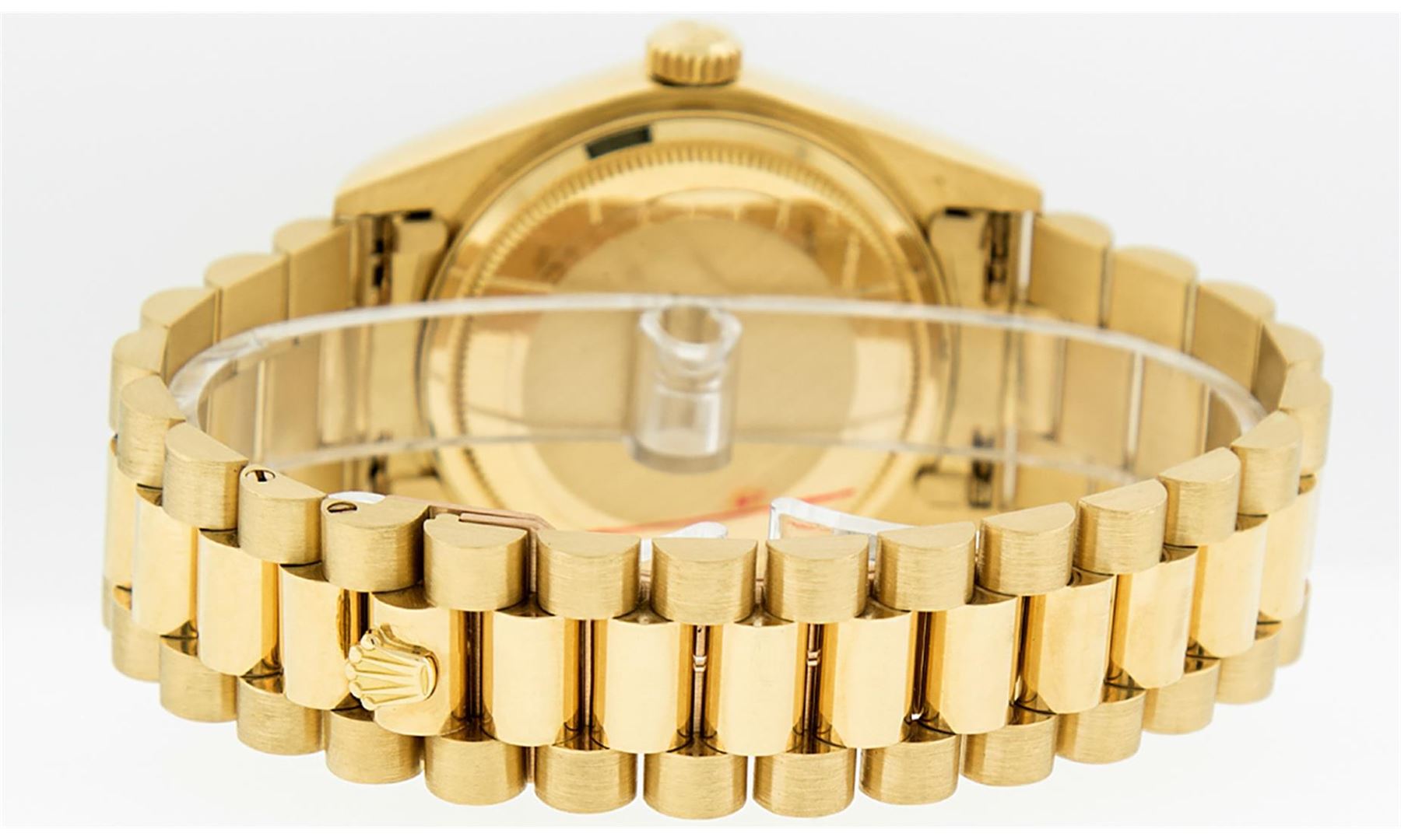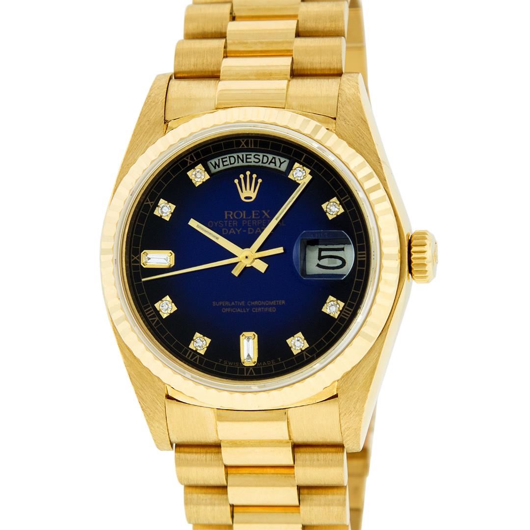 One Men's Pre Owned Quickset Rolex Day Date 18K Yellow Gold President Polished, Serviced & Electronically Tested, Rolex 18K Yellow Gold Case: 36mm, Rolex 18K Yellow Gold Crown, Rolex Bezel: 18K Yellow Gold Fluted Bezel. Custom Crystal: New Scratch Resistant Synthetic Sapphire Cyclops Lens. Custom Hands: New Luminescent Hands. Rolex Movement: Automatic Quickset Winding Movement Caliber 3055. Custom Dial: Refinished To Blue Vignette With Custom Added Genuine Single Cut Diamonds Track. Date Window: 3 O'clock Position, Day Display: 12 O'clock Position, Single Quickset, Model: Day Date President. Condition: G-6 Extra Fine. Rolex Bracelet: Rolex 18K Yellow Gold President Band With Hidden Clasp, Bright & Satin Polish. 7.0 Inch Length, Standard President Clasp, With Rolex Logo.