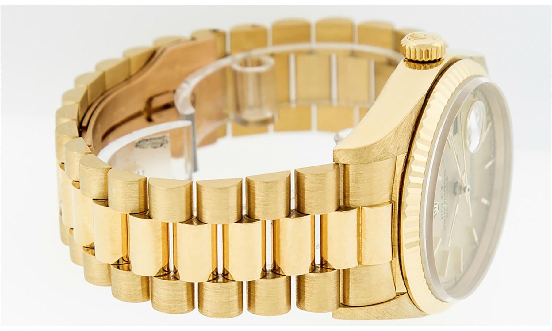 One Men's Pre Owned Quickset Rolex Day Date 18K Yellow Gold President Polished, Serviced & Electronically Tested, Rolex 18K Yellow Gold Case: 36mm, Rolex 18K Yellow Gold Crown, Rolex Bezel: 18K Yellow Gold Fluted Bezel. Custom Crystal: New Scratch Resistant Synthetic Sapphire Cyclops Lens. Rolex Movement: Automatic Quickset Winding Movement Caliber 3055. Rolex Dial: Champagne Index With Roman Track & Lumi Dots. Date Window: 3 O'clock Position, Day Display: 12 O'clock Position, Single Quickset, Model: Day Date President. Condition: G-6 Extra Fine. Rolex Bracelet: 18K Yellow Gold President Band With Hidden Clasp, Bright & Satin Polish. 7.0 Inch Length, Standard President Clasp, With Rolex Logo.