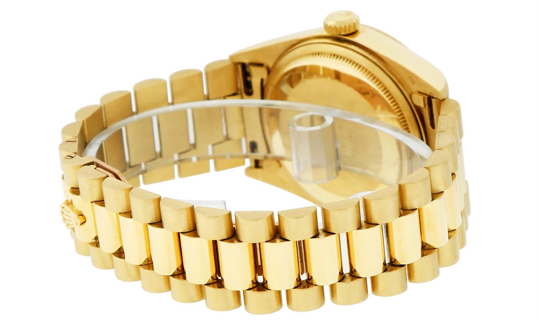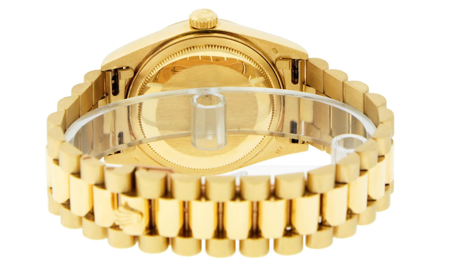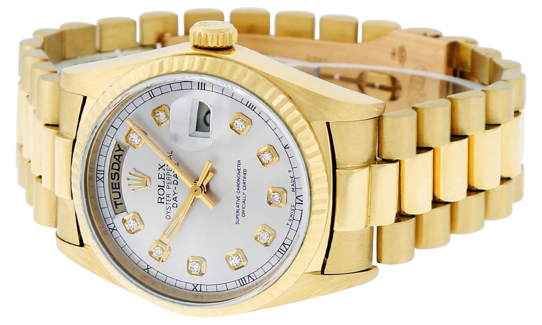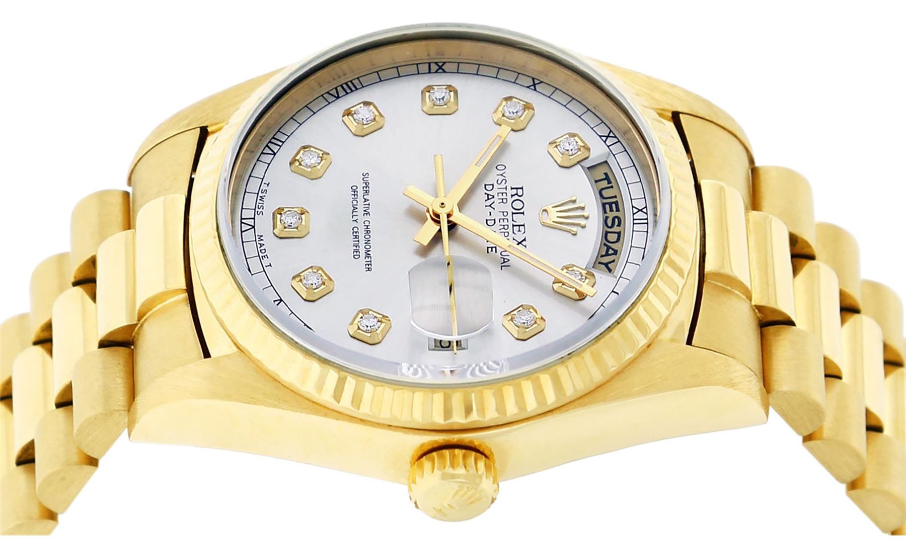 One Men's Pre Owned Quickset Rolex Day Date 18K Yellow Gold Presidential Polished, Serviced & Electronically Tested, Rolex 18K Yellow Gold Case: 36mm, Rolex 18K Yellow Gold Crown, Rolex Bezel: 18K Yellow Gold Fluted Bezel. Custom Crystal: New Scratch Resistant Synthetic Sapphire Cyclops Lens. Custom Hands: New Luminescent Hands. Rolex Movement: Automatic Quickset Winding Movement Caliber 3055. Custom Dial: Refinished To Silver With Custom Added Genuine Single Cut Diamonds, Diamond Count: 10 Diamonds On Dial, Color: G To H, Clarity: SI-VS. Date Window: 3 O'clock Position, Day Display: 12 O'clock Position, Single Quickset, Model: Day Date President. Condition: G-6 Extra Fine. Rolex Bracelet: 18K Yellow Gold President Band With Hidden Clasp, Bright & Satin Polish. 7.0 Inch Length, Standard President Clasp, With Rolex Logo.