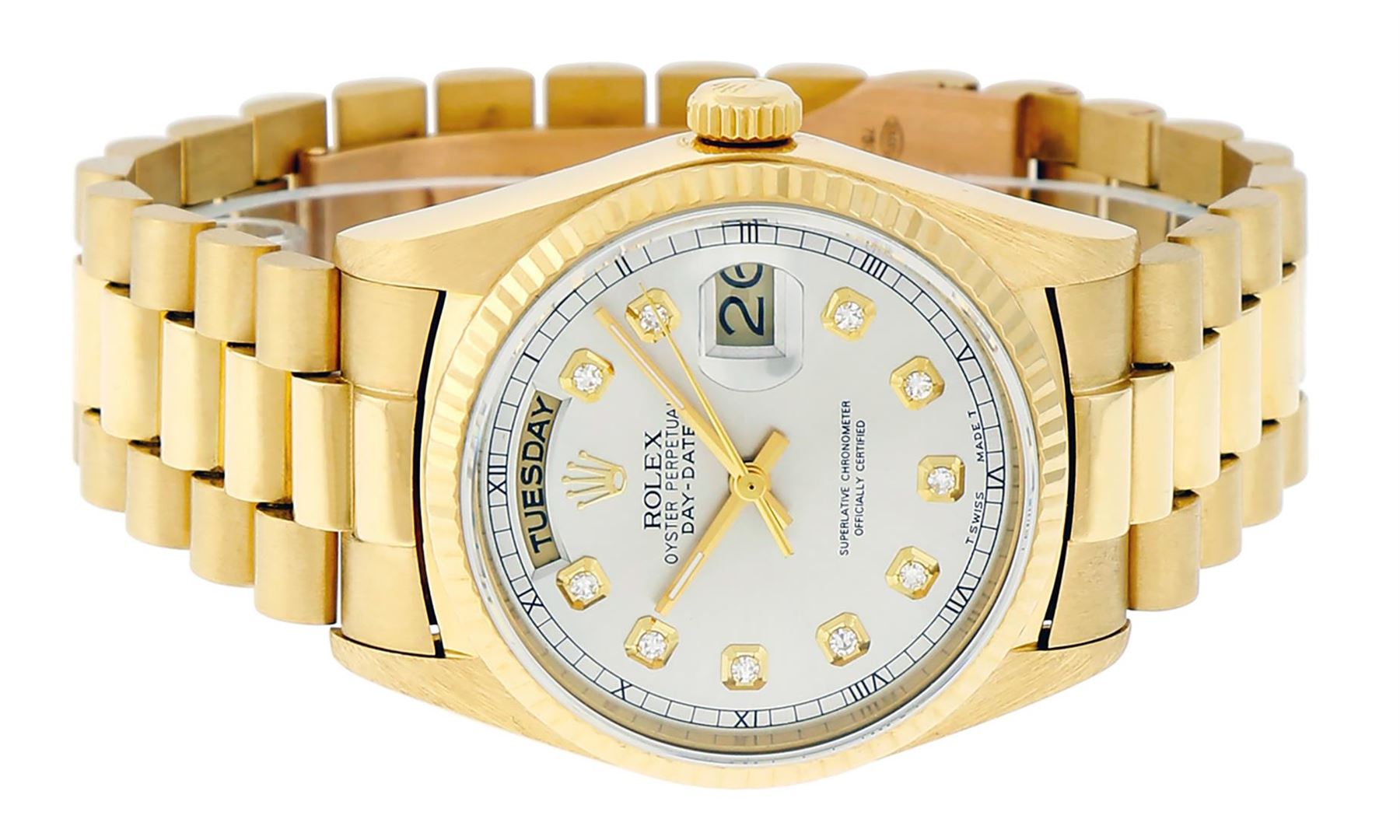 One Men's Pre Owned Quickset Rolex Day Date 18K Yellow Gold Presidential Polished, Serviced & Electronically Tested, Rolex 18K Yellow Gold Case: 36mm, Rolex 18K Yellow Gold Crown, Rolex Bezel: 18K Yellow Gold Fluted Bezel. Custom Crystal: New Scratch Resistant Synthetic Sapphire Cyclops Lens. Custom Hands: New Luminescent Hands. Rolex Movement: Automatic Quickset Winding Movement Caliber 3055. Custom Dial: Refinished To Silver With Custom Added Genuine Single Cut Diamonds, Diamond Count: 10 Diamonds On Dial, Color: G To H, Clarity: SI-VS. Date Window: 3 O'clock Position, Day Display: 12 O'clock Position, Single Quickset, Model: Day Date President. Condition: G-6 Extra Fine. Rolex Bracelet: 18K Yellow Gold President Band With Hidden Clasp, Bright & Satin Polish. 7.0 Inch Length, Standard President Clasp, With Rolex Logo.
