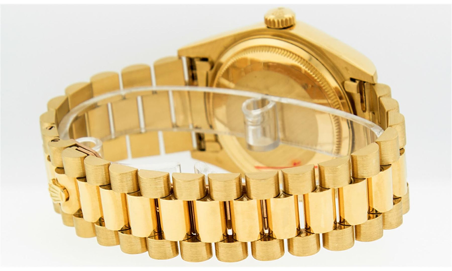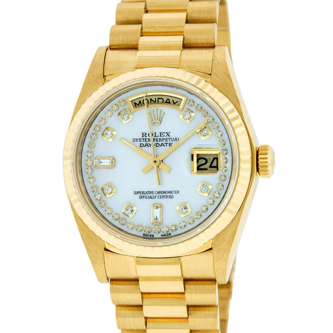 One Men's Pre Owned Quickset Rolex Day Date 18K Yellow Gold President Polished, Serviced & Electronically Tested, Rolex 18K Yellow Gold Case: 36mm, Rolex 18K Yellow Gold Crown, Rolex Bezel: 18K Yellow Gold Fluted Bezel. Custom Crystal: New Synthetic Sapphire Cyclops Lens. Custom Hands: New Luminescent Hands. Rolex Movement: Automatic Quickset Winding Movement Caliber 3055. Custom Dial: Refinished To Mother Of Pearl With Custom Added String Single Cut Diamonds, Diamond Count: 49 Diamonds + 2 Diamond Baguettes, Color: G To H, Clarity: SI - VS, Date Window: 3 O'Clock Position, Day Display: 12 O'Clock Position, Single Quickset, Model: Day Date President. Condition: G-6 Extra Fine. Rolex Bracelet: 18K Yellow Gold President Band With Hidden Clasp, Bright & Satin Polish. 7.0 Inch Length, Standard President Clasp, With Rolex Logo.