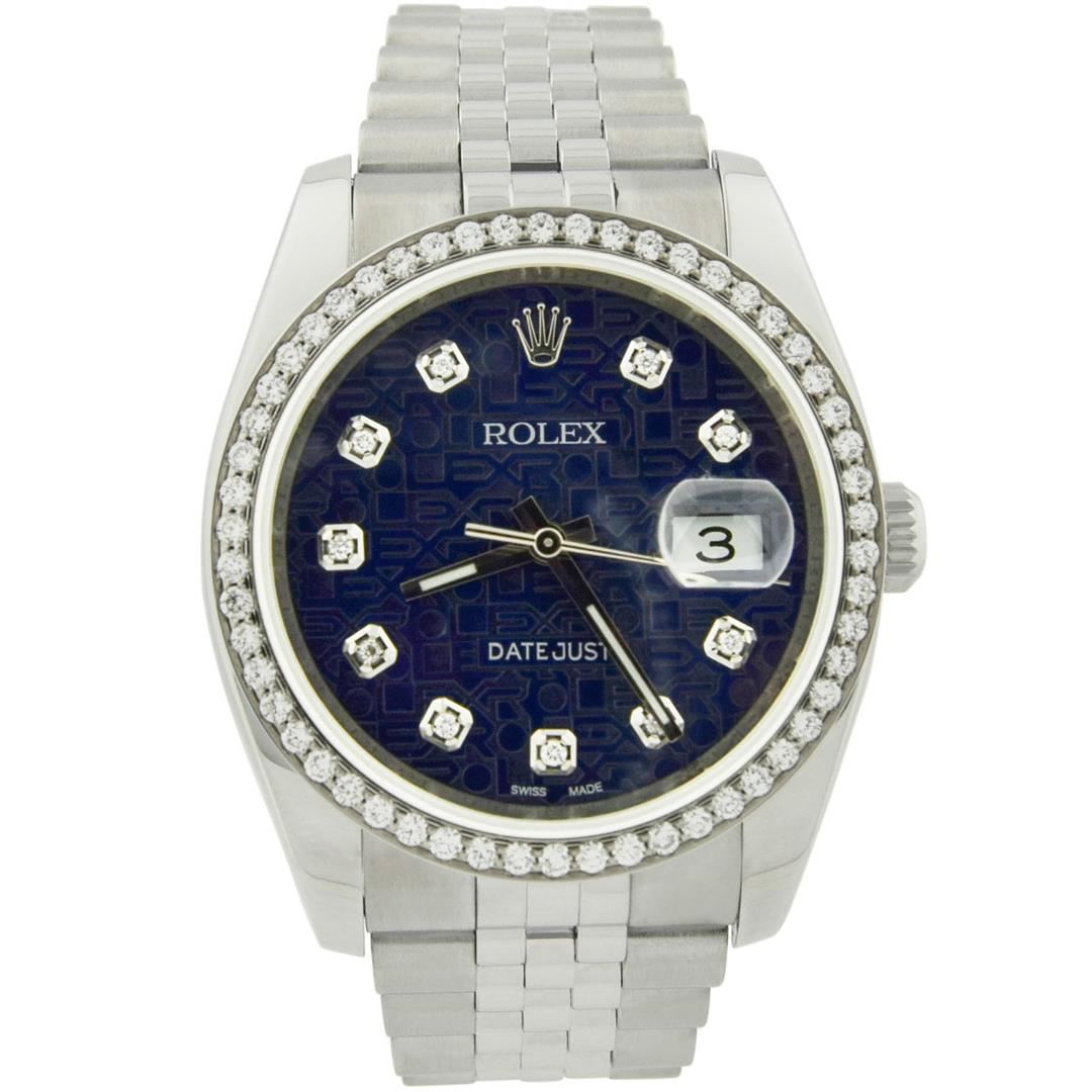 Rolex Datejust Mens 36mm Blue and Grey Diamond Dial Steel Polished & Electronically Tested. Model: Datejust 116234. Case: Stainless Steel. Bezel: Custom made diamond bezel with round brilliant diamonds all set in prong setting. Total Weight 0.85ctw Clarity: VS-SI Color:G-H. Bracelet: Stainless Steel, Little Loose. Dial: Original Blue and Grey 0.10ctw Diamonds. Date Window: 3 O'clock Position date display. Movement: Automatic Winding Movement. Water Resistant: Yes. Case Size: 36mm. Condition: Pre Owned, Watch is free of all Scratches and Dents, Extra Fine G-6.