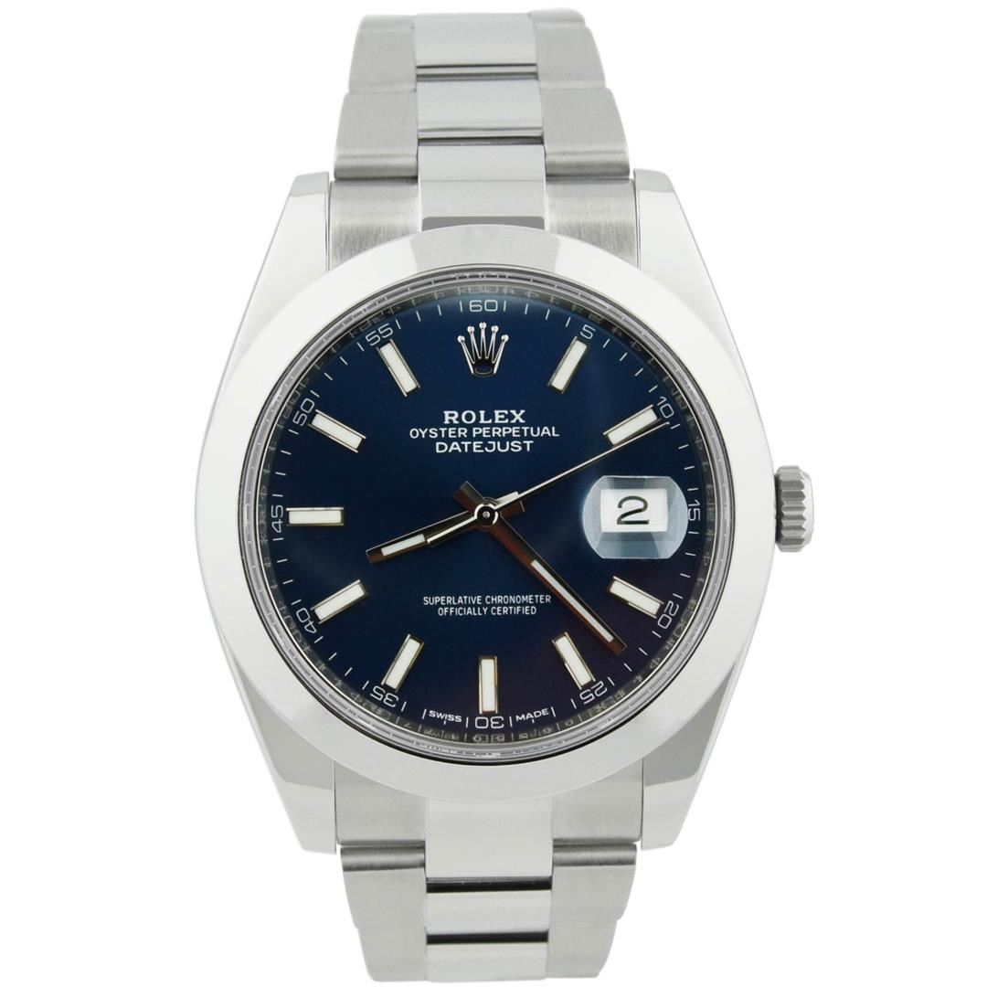Rolex Mens Datejust Stainless Steel 41mm Blue Luminous Stick Dial Watch Polished & Electronically Tested. Model: Datejust. Case: Stainless Steel. Crystal: Sapphire Crystal. Bracelet: Stainless Steel, Adjustable Standard Clasp with Rolex Logo. Dial: Blue Luminous Stick Dial. Date Window: 3 O'clock Position. Movement: Automatic Winding Movement. Water Resistant: Yes. Case Size: 41mm. Condition: Pre Owned, Watch is free of all Scratches and Dents, Near Mint G-7.