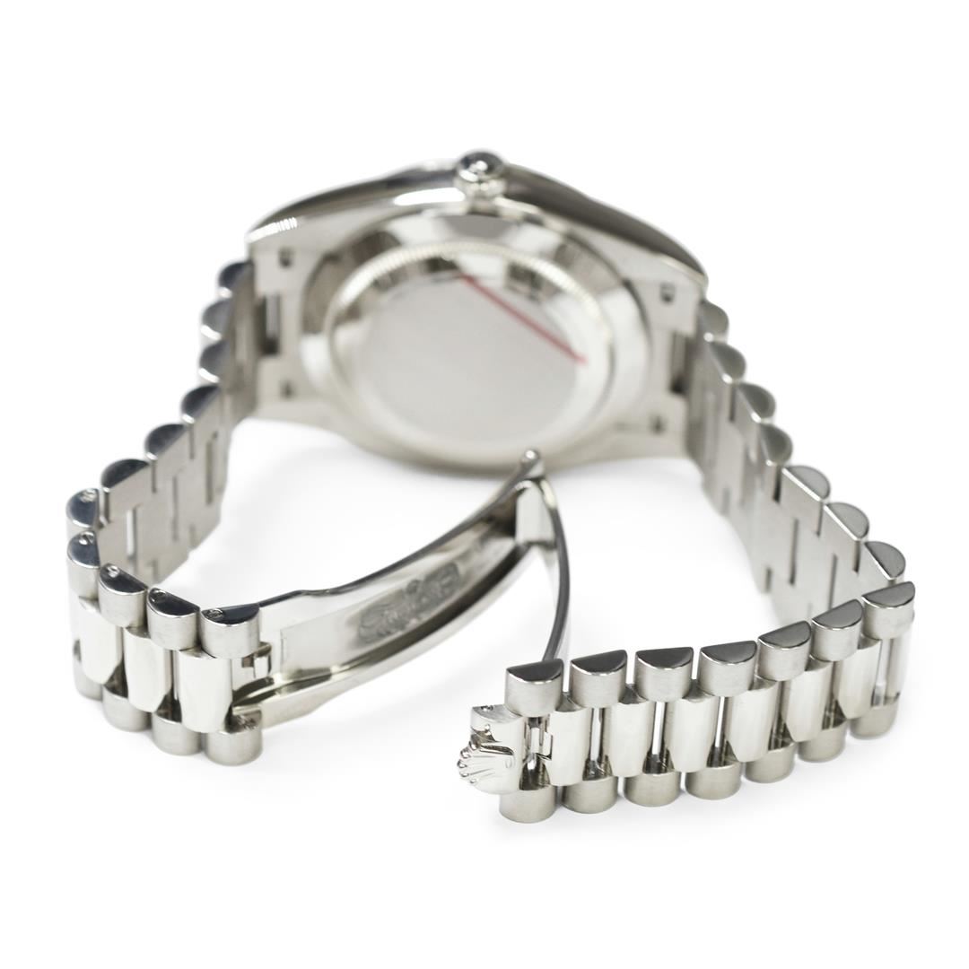 Rolex Day-Date President Mens 40mm Silver Roman Dial 18KT White Gold Polished & Electronically Tested. Model: Day-Date 228239. Case: 18KT White Gold. Crystal: Sapphire. Bracelet: 18KT White Gold. Dial: Original Silver Color, Stripe Design with Roman Numerals. Date Window: 3 O'clock Position date display. Movement: Automatic Winding Movement. Water Resistant: Yes. Case Size: 40mm. Condition: Pre Owned, Watch is free of all Scratches and Dents, Mint G-8.