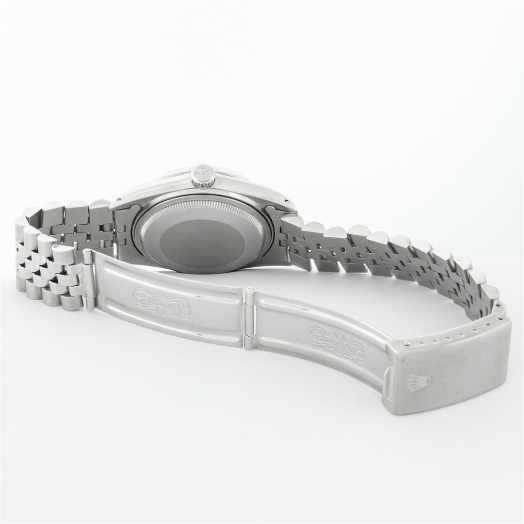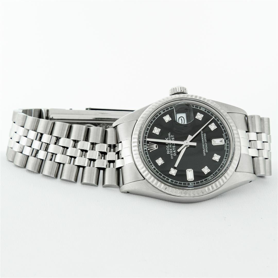 One Men's Pre Owned Stainless Steel Rolex Datejust Polished Bright with Satin Finish, This Watch Has Been Serviced & Electronically Tested, Rolex Stainless Steel Case: 36mm, Rolex Stainless Steel Crown, Rolex Bezel: 14K White Gold Fluted Bezel. Custom Crystal: New Acrylic Cyclops Lens. Custom Hands: New Luminescent Hands. Rolex Movement: Automatic Winding Movement. Custom Dial: Refinished To Black With Added Diamonds 8 + 2 Dial With Roman Track, Diamond Count: 8 Diamonds + 2 Baguettes in Dial G To H In Color, SI-VS Clarity. Date Window: 3 O'Clock Position Date Display, Quickset, Model: Datejust, Condition: G-6 Extra Fine. Rolex Bracelet: Stainless Steel Jubilee Band. Bright Polish & Satin Finish. 7.0 Inch Length, Adjustable. Standard Clasp, With Rolex Logo. This Watch Has Been Serviced Time Tested And Is In Excellent Condition It Is Free Of All Scratches And Dents.