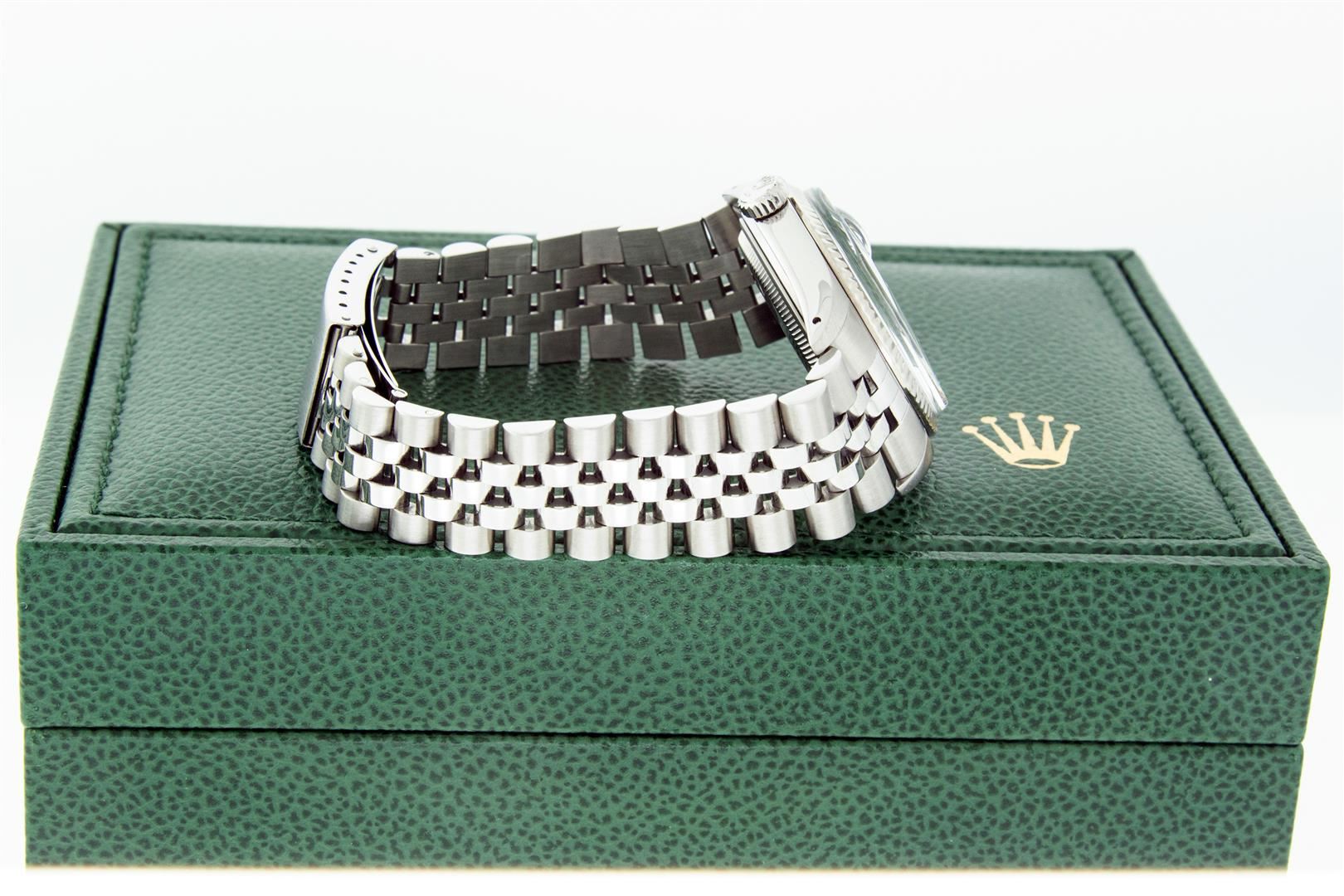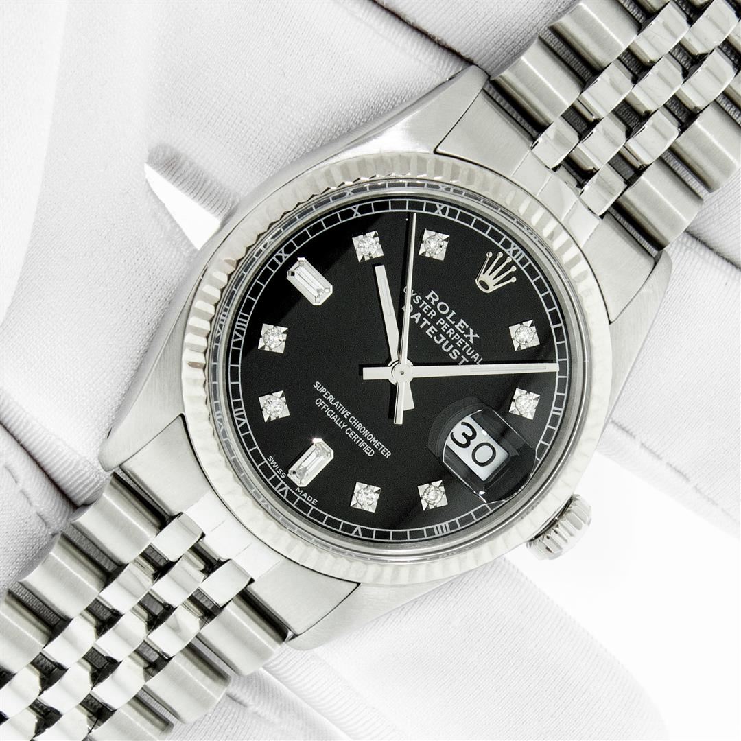 One Men's Pre Owned Stainless Steel Rolex Datejust Polished Bright with Satin Finish, This Watch Has Been Serviced & Electronically Tested, Rolex Stainless Steel Case: 36mm, Rolex Stainless Steel Crown, Rolex Bezel: 14K White Gold Fluted Bezel. Custom Crystal: New Acrylic Cyclops Lens. Custom Hands: New Luminescent Hands. Rolex Movement: Automatic Winding Movement. Custom Dial: Refinished To Black With Custom Added Diamonds 8 + 2 Dial With Roman Track, Diamond Count: 8 Diamonds + 2 Baguettes in Dial G To H In Color, SI-VS Clarity. Date Window: 3 O'Clock Position Date Display, Quickset, Model: Datejust, Condition: G-6 Extra Fine. Rolex Bracelet: Stainless Steel Jubilee Band. Bright Polish & Satin Finish. 7.0 Inch Length, Adjustable. Standard Clasp, With Rolex Logo. This Watch Has Been Serviced Time Tested And Is In Excellent Condition It Is Free Of All Scratches And Dents.