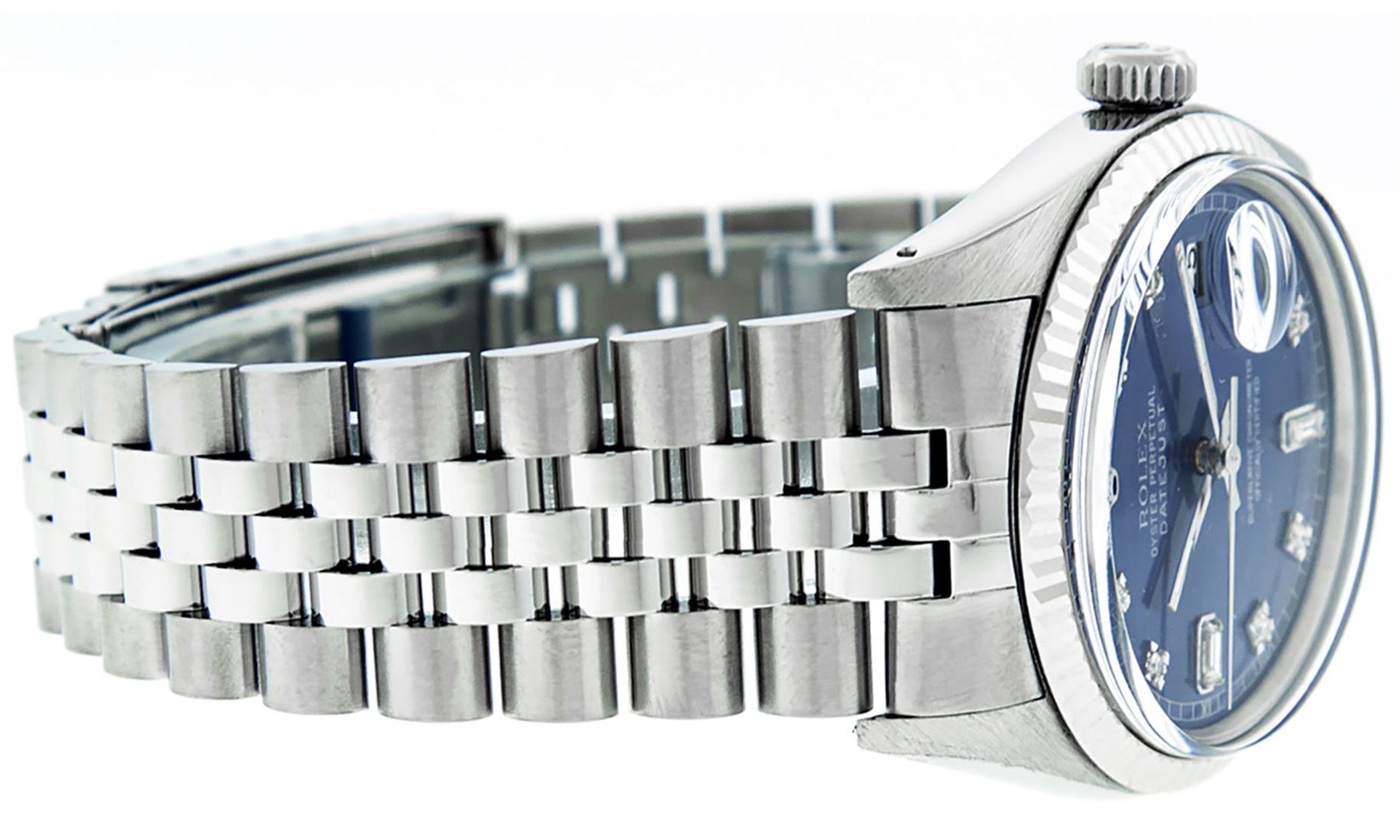 One Men's Stainless Steel Rolex Datejust Polished Bright with Satin Finish, This Watch Has Been Serviced & Electronically Tested, Stainless Steel Case: 36mm, Stainless Steel Crown, Bezel: 14K White Gold Fluted Bezel. Custom Crystal: New Acrylic Cyclops Lens. Custom Hands: New Luminescent Hands. Movement: Automatic Winding Movement Caliber 3035. Custom Dial: Blue Diamond Dial With Diamond Hour Markers, Diamond Count: 8 Diamonds + 2 Diamond Baguettes in Dial, G To H In Color, SI-VS Clarity. Date Window: 3 O'clock Position Date Display, Quickset, Model: Datejust, Condition: G-6 Extra Fine. Bracelet: Stainless Steel Jubilee. Bright Polish & Satin Finish. 7.0 Inch Length, Adjustable. Standard Clasp, With Rolex Logo. This Watch Has Been Serviced Time Tested And Is In Excellent Condition It Is Free Of All Scratches And Dents