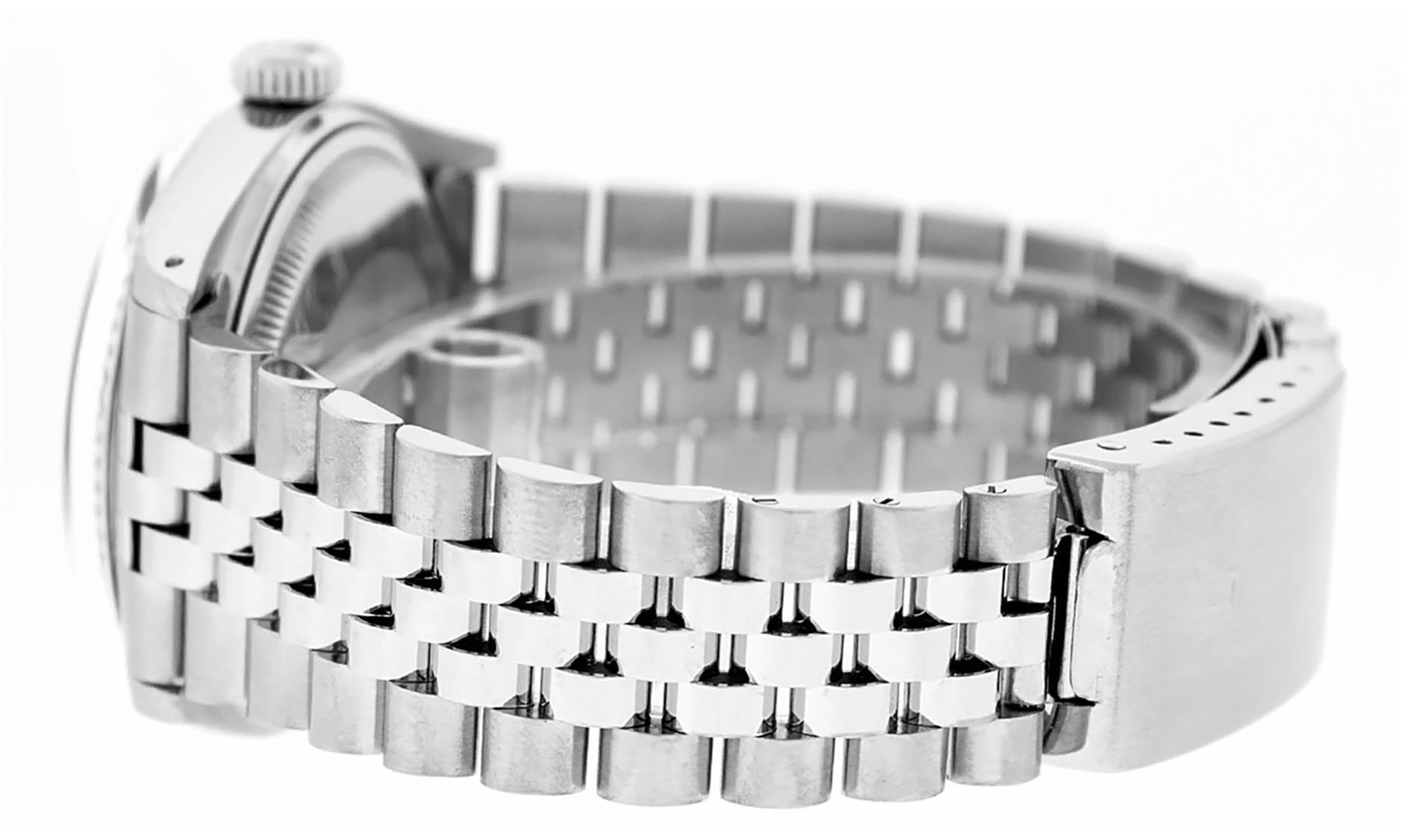 One Men's Stainless Steel Rolex Datejust Polished Bright with Satin Finish, This Watch Has Been Serviced & Electronically Tested, Stainless Steel Case: 36mm, Stainless Steel Crown, Bezel: 14K White Gold Fluted Bezel. Custom Crystal: New Acrylic Cyclops Lens. Custom Hands: New Luminescent Hands. Movement: Automatic Winding Movement Caliber 3035. Custom Dial: Blue Diamond Dial With Diamond Hour Markers, Diamond Count: 8 Diamonds + 2 Diamond Baguettes in Dial, G To H In Color, SI-VS Clarity. Date Window: 3 O'clock Position Date Display, Quickset, Model: Datejust, Condition: G-6 Extra Fine. Bracelet: Stainless Steel Jubilee. Bright Polish & Satin Finish. 7.0 Inch Length, Adjustable. Standard Clasp, With Rolex Logo. This Watch Has Been Serviced Time Tested And Is In Excellent Condition It Is Free Of All Scratches And Dents