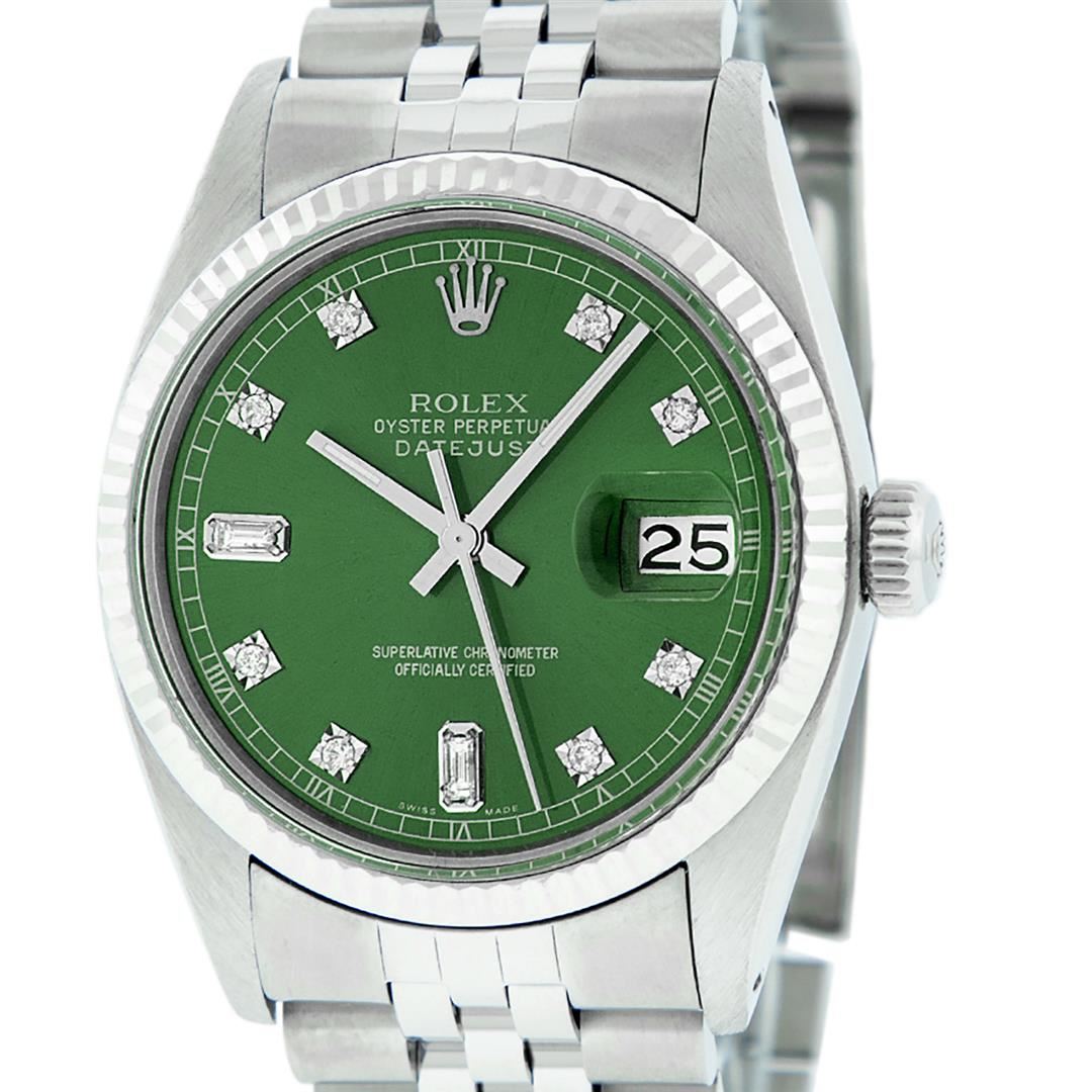 One Men's Pre Owned Rolex Stainless Steel Rolex Datejust Polished Bright with Satin Finish, This Watch Has Been Serviced & Electronically Tested, Stainless Steel Case: 36mm, Rolex Stainless Steel Crown, Rolex Bezel: 14K White Gold Fluted Bezel. Custom Crystal: New Acrylic Cyclops Lens. Custom Hands: New Luminescent Hands. Rolex Movement: Automatic Winding Movement. Custom Dial: Refinished To Green With Custom Added Genuine Diamonds, Diamond Count: 8 Diamonds + 2 Diamond Baguettes In Dial G To H In Color, SI-VS Clarity. Date Window: 3 O'clock Position Date Display, Quickset, Model: Datejust, Condition: G-6 Extra Fine. Rolex Bracelet: Stainless Steel Jubilee Band. Bright Polish & Satin Finish. 7.0 Inch Length, Adjustable. Standard Clasp, With Rolex Logo. This Watch Has Been Serviced Time Tested And Is In Excellent Condition It Is Free Of All Scratches And Dents.