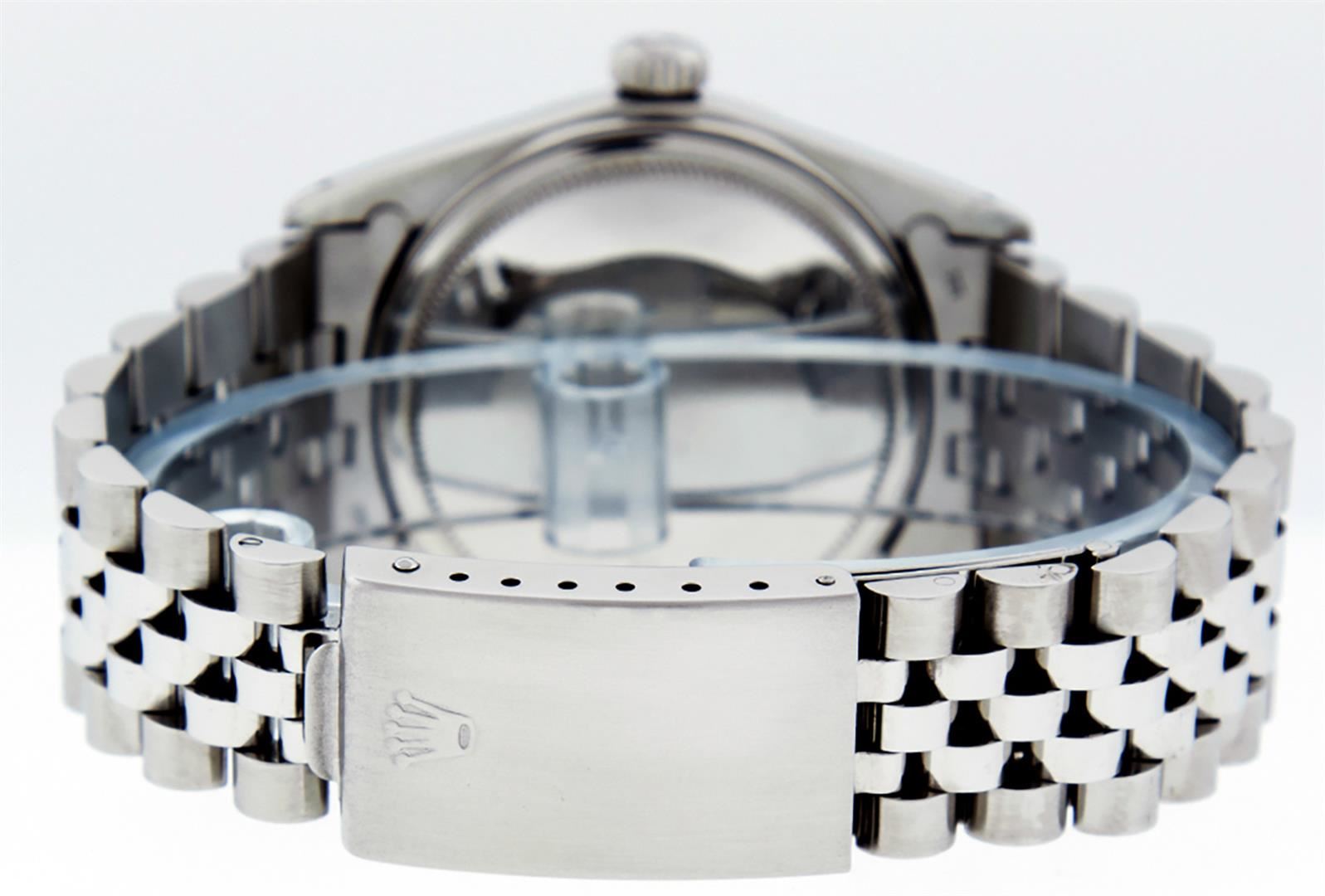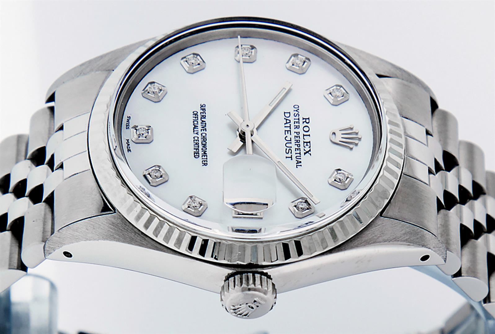 One Men's Stainless Steel Rolex Datejust Polished Bright with Satin Finish, This Watch Has Been Serviced & Electronically Tested, Stainless Steel Case: 36mm, Stainless Steel Crown, Bezel: 14K White Gold Fluted Bezel. Custom Crystal: New Acrylic Cyclops Lens. Custom Hands: New Luminescent Hands. Movement: Automatic Winding Movement Caliber 3035. Custom Dial: Mother Of Pearl Diamond Dial With Diamond Hour Markers, Diamond Count: 10 Diamonds in Dial G To H In Color, SI-VS Clarity. Date Window: 3 O'clock Position Date Display, Quickset, Model: Datejust, Condition: G-6 Extra Fine. Bracelet: Stainless Steel Jubilee. Bright Polish & Satin Finish. 7.0 Inch Length, Adjustable. Standard Clasp, With Rolex Logo. This Watch Has Been Serviced Time Tested And Is In Excellent Condition It Is Free Of All Scratches And Dents