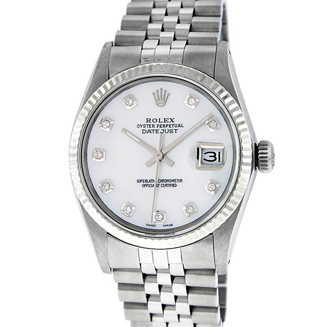 One Men's Stainless Steel Rolex Datejust Polished Bright with Satin Finish, This Watch Has Been Serviced & Electronically Tested, Stainless Steel Case: 36mm, Stainless Steel Crown, Bezel: 14K White Gold Fluted Bezel. Custom Crystal: New Acrylic Cyclops Lens. Custom Hands: New Luminescent Hands. Movement: Automatic Winding Movement Caliber 3035. Custom Dial: Mother Of Pearl Diamond Dial With Diamond Hour Markers, Diamond Count: 10 Diamonds in Dial G To H In Color, SI-VS Clarity. Date Window: 3 O'clock Position Date Display, Quickset, Model: Datejust, Condition: G-6 Extra Fine. Bracelet: Stainless Steel Jubilee. Bright Polish & Satin Finish. 7.0 Inch Length, Adjustable. Standard Clasp, With Rolex Logo. This Watch Has Been Serviced Time Tested And Is In Excellent Condition It Is Free Of All Scratches And Dents