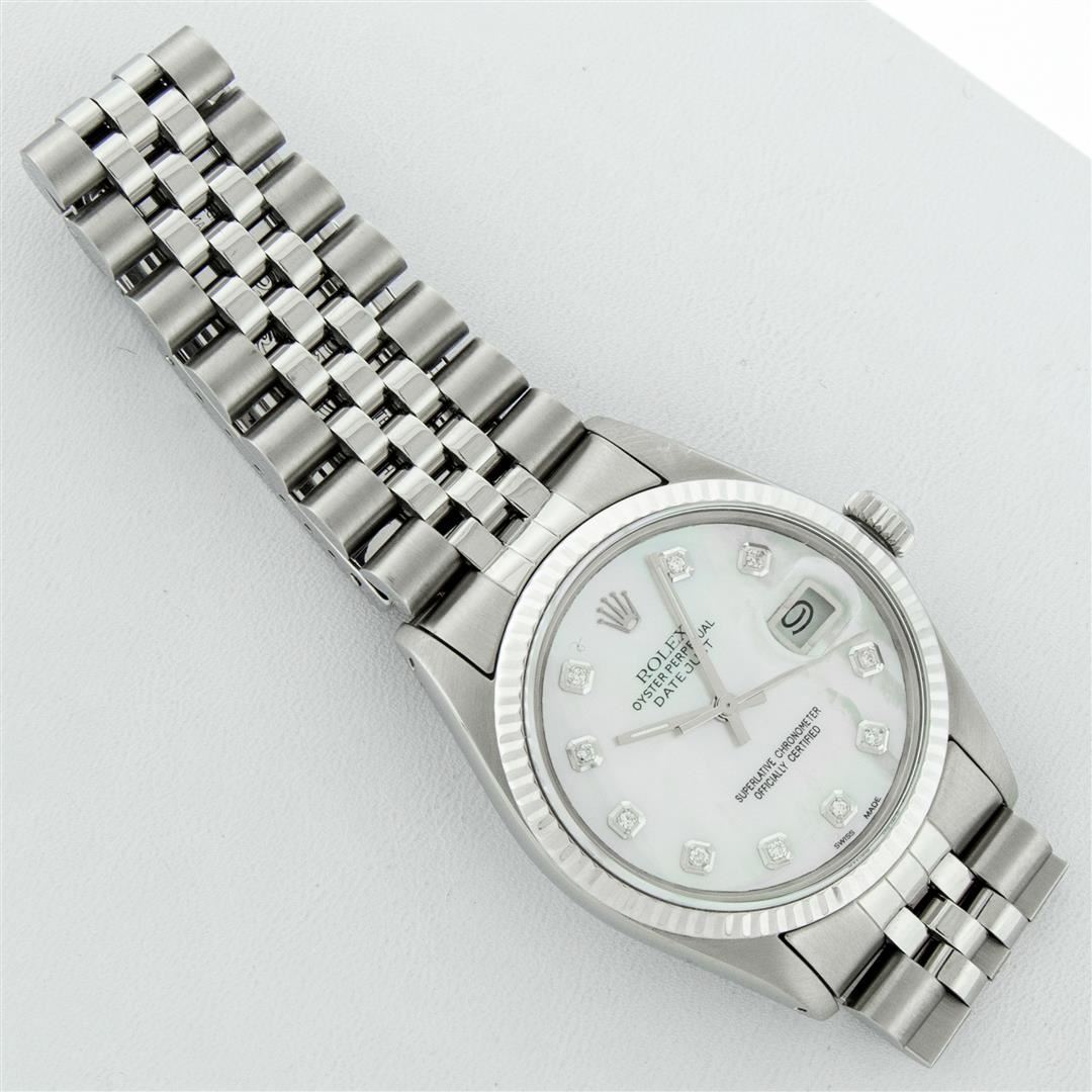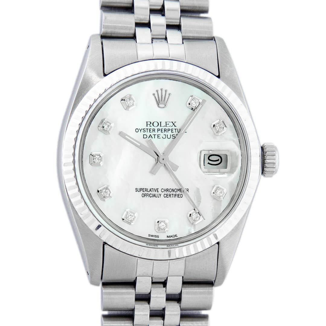 One Men's Pre Owned Stainless Steel Rolex Datejust Polished Bright with Satin Finish, This Watch Has Been Serviced & Electronically Tested, Rolex Stainless Steel Case: 36mm, Rolex Stainless Steel Crown, Rolex Bezel: 14K White Gold Fluted Bezel. Custom Crystal: New Acrylic Cyclops Lens. Custom Hands: New Luminescent Hands. Rolex Movement: Automatic Winding Movement. Custom Dial: Refinished To Mother Of Pearl Diamond Dial With Added Diamond Hour Markers, Diamond Count: 10 Diamonds in Dial G To H In Color, SI-VS Clarity. Date Window: 3 O'Clock Position Date Display, Quickset, Model: Datejust, Condition: G-6 Extra Fine. Rolex Bracelet: Stainless Steel Jubilee Band. Bright Polish & Satin Finish. 7.0 Inch Length, Adjustable. Standard Clasp, With Rolex Logo. This Watch Has Been Serviced Time Tested And Is In Excellent Condition It Is Free Of All Scratches And Dents.