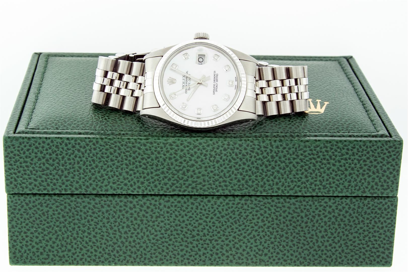 One Men's Stainless Steel Rolex Datejust Polished Bright with Satin Finish, This Watch Has Been Serviced & Electronically Tested, Rolex Stainless Steel Case: 36mm, Rolex Stainless Steel Crown, Rolex Bezel: 14K White Gold Fluted Bezel. Custom Crystal: New Acrylic With Magnified Date Window. Custom Hands: New Luminescent Hands. Rolex Movement: Automatic Winding Movement. Custom Dial: Mother Of Pearl Diamond Dial With Custom Added Diamond Hour Markers, Diamond Count: 10 Diamonds in Dial G To H In Color, SI-VS Clarity. Date Window: 3 O'clock Position Date Display, Quickset, Model: Datejust, Condition: G-6 Extra Fine. Rolex Bracelet: Stainless Steel Jubilee Band. Bright Polish & Satin Finish. 7.0 Inch Length, Adjustable. Standard Clasp, With Rolex Logo. This Pre Owned Watch Has Been Serviced Time Tested And Is In Excellent Condition It Is Free Of All Scratches And Dents.