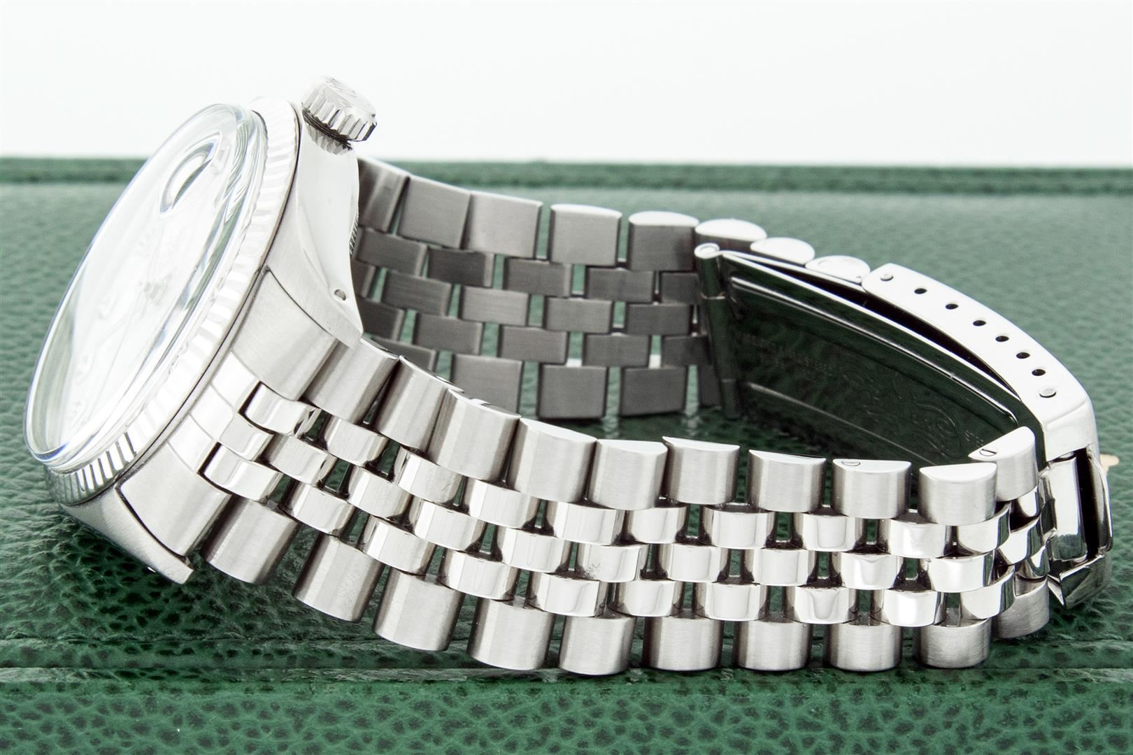 One Men's Stainless Steel Rolex Datejust Polished Bright with Satin Finish, This Watch Has Been Serviced & Electronically Tested, Rolex Stainless Steel Case: 36mm, Rolex Stainless Steel Crown, Rolex Bezel: 14K White Gold Fluted Bezel. Custom Crystal: New Acrylic With Magnified Date Window. Custom Hands: New Luminescent Hands. Rolex Movement: Automatic Winding Movement. Custom Dial: Mother Of Pearl Diamond Dial With Custom Added Diamond Hour Markers, Diamond Count: 10 Diamonds in Dial G To H In Color, SI-VS Clarity. Date Window: 3 O'clock Position Date Display, Quickset, Model: Datejust, Condition: G-6 Extra Fine. Rolex Bracelet: Stainless Steel Jubilee Band. Bright Polish & Satin Finish. 7.0 Inch Length, Adjustable. Standard Clasp, With Rolex Logo. This Pre Owned Watch Has Been Serviced Time Tested And Is In Excellent Condition It Is Free Of All Scratches And Dents.