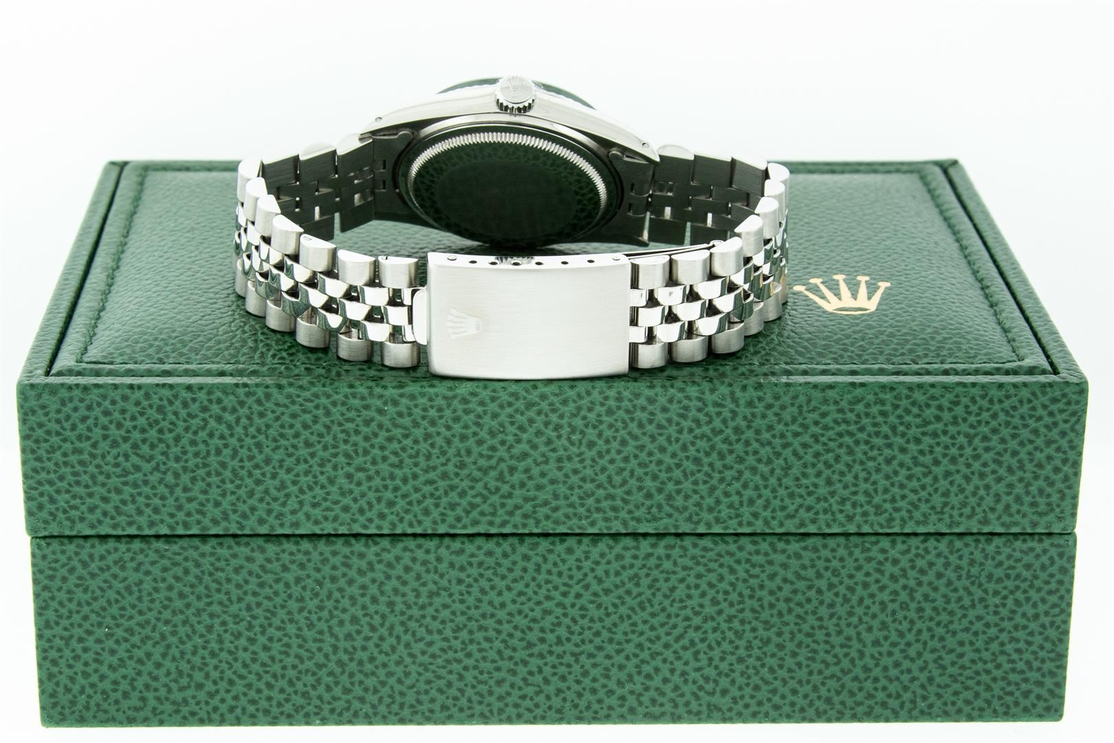 One Men's Stainless Steel Rolex Datejust Polished Bright with Satin Finish, This Watch Has Been Serviced & Electronically Tested, Rolex Stainless Steel Case: 36mm, Rolex Stainless Steel Crown, Rolex Bezel: 14K White Gold Fluted Bezel. Custom Crystal: New Acrylic With Magnified Date Window. Custom Hands: New Luminescent Hands. Rolex Movement: Automatic Winding Movement. Custom Dial: Mother Of Pearl Diamond Dial With Custom Added Diamond Hour Markers, Diamond Count: 10 Diamonds in Dial G To H In Color, SI-VS Clarity. Date Window: 3 O'clock Position Date Display, Quickset, Model: Datejust, Condition: G-6 Extra Fine. Rolex Bracelet: Stainless Steel Jubilee Band. Bright Polish & Satin Finish. 7.0 Inch Length, Adjustable. Standard Clasp, With Rolex Logo. This Pre Owned Watch Has Been Serviced Time Tested And Is In Excellent Condition It Is Free Of All Scratches And Dents.