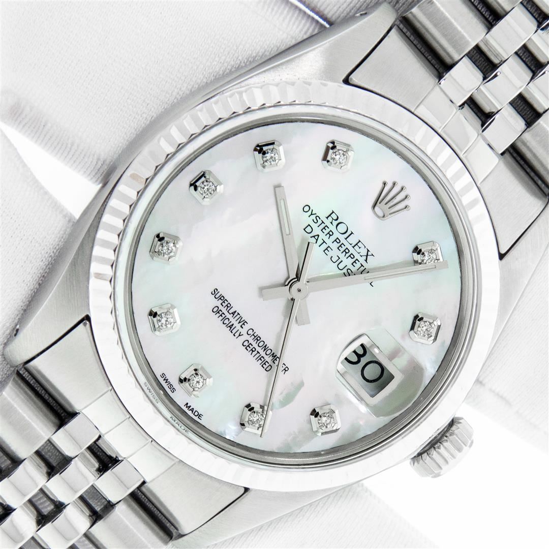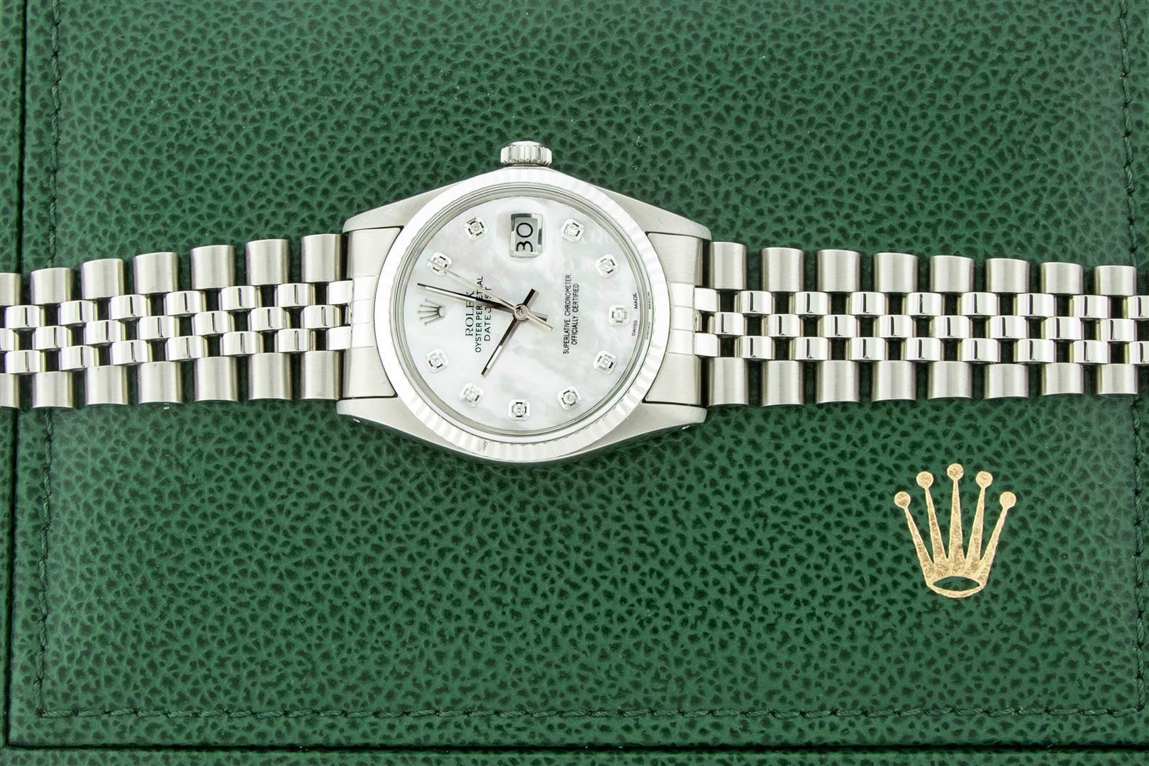 One Men's Stainless Steel Rolex Datejust Polished Bright with Satin Finish, This Watch Has Been Serviced & Electronically Tested, Rolex Stainless Steel Case: 36mm, Rolex Stainless Steel Crown, Rolex Bezel: 14K White Gold Fluted Bezel. Custom Crystal: New Acrylic With Magnified Date Window. Custom Hands: New Luminescent Hands. Rolex Movement: Automatic Winding Movement. Custom Dial: Mother Of Pearl Diamond Dial With Custom Added Diamond Hour Markers, Diamond Count: 10 Diamonds in Dial G To H In Color, SI-VS Clarity. Date Window: 3 O'clock Position Date Display, Quickset, Model: Datejust, Condition: G-6 Extra Fine. Rolex Bracelet: Stainless Steel Jubilee Band. Bright Polish & Satin Finish. 7.0 Inch Length, Adjustable. Standard Clasp, With Rolex Logo. This Pre Owned Watch Has Been Serviced Time Tested And Is In Excellent Condition It Is Free Of All Scratches And Dents.