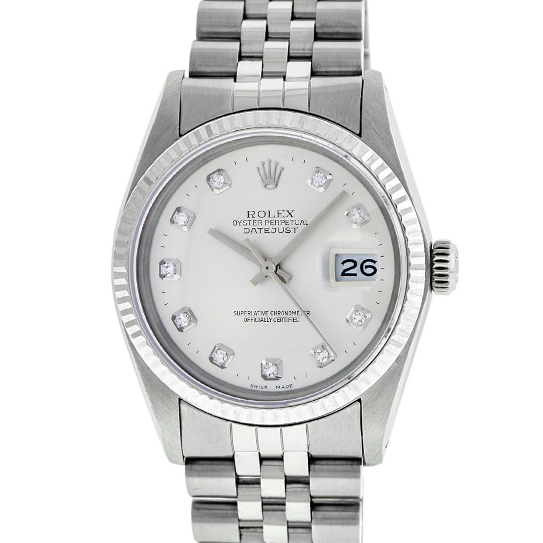 One Men's Stainless Steel Rolex Datejust Polished Bright with Satin Finish, This Watch Has Been Serviced & Electronically Tested, Stainless Steel Case: 36mm, Stainless Steel Crown, Bezel: 14K White Gold Fluted Bezel. Custom Crystal: New Acrylic Cyclops Lens. Custom Hands: New Luminescent Hands. Movement: Automatic Winding Movement Caliber 3035. Custom Dial: Silver Diamond Dial With Diamond Hour Markers, Diamond Count: 10 Diamonds in Dial G To H In Color, SI-VS Clarity. Date Window: 3 O'clock Position Date Display, Quickset, Model: Datejust, Condition: G-6 Extra Fine. Bracelet: Stainless Steel Jubilee. Bright Polish & Satin Finish. 7.0 Inch Length, Adjustable. Standard Clasp, With Rolex Logo. This Watch Has Been Serviced Time Tested And Is In Excellent Condition It Is Free Of All Scratches And Dents