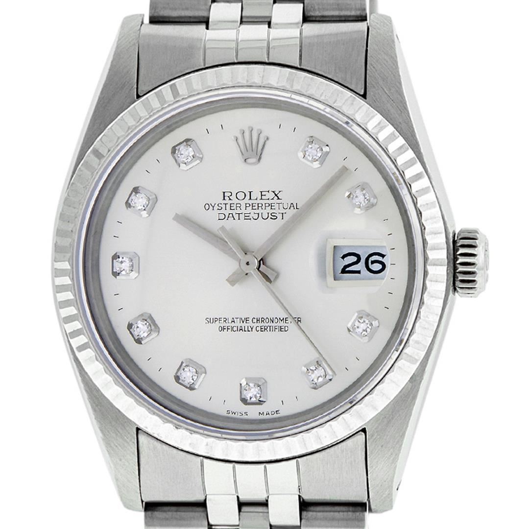 One Men's Stainless Steel Rolex Datejust Polished Bright with Satin Finish, This Watch Has Been Serviced & Electronically Tested, Stainless Steel Case: 36mm, Stainless Steel Crown, Bezel: 14K White Gold Fluted Bezel. Custom Crystal: New Acrylic Cyclops Lens. Custom Hands: New Luminescent Hands. Movement: Automatic Winding Movement Caliber 3035. Custom Dial: Silver Diamond Dial With Diamond Hour Markers, Diamond Count: 10 Diamonds in Dial G To H In Color, SI-VS Clarity. Date Window: 3 O'clock Position Date Display, Quickset, Model: Datejust, Condition: G-6 Extra Fine. Bracelet: Stainless Steel Jubilee. Bright Polish & Satin Finish. 7.0 Inch Length, Adjustable. Standard Clasp, With Rolex Logo. This Watch Has Been Serviced Time Tested And Is In Excellent Condition It Is Free Of All Scratches And Dents