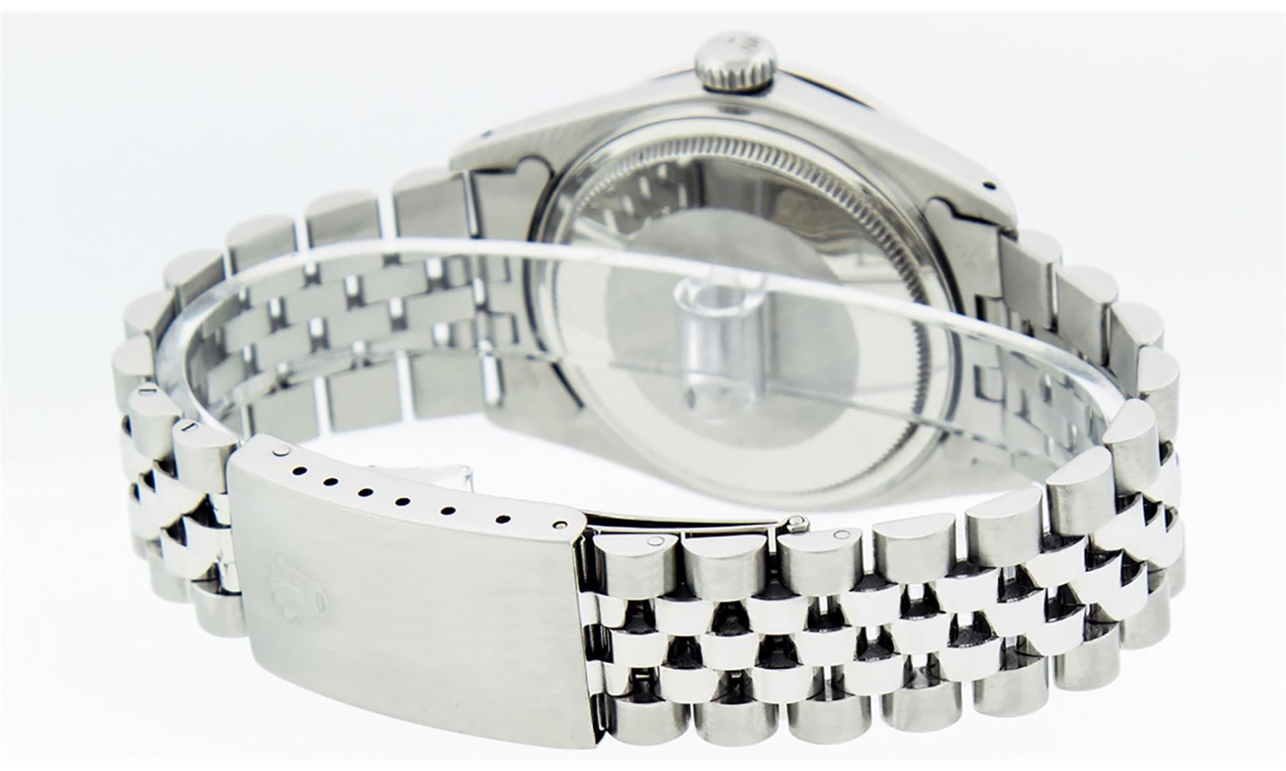 One Men's Stainless Steel Rolex Datejust Polished Bright with Satin Finish, This Watch Has Been Serviced & Electronically Tested, Stainless Steel Case: 36mm, Stainless Steel Crown, Bezel: 14K White Gold Fluted Bezel. Custom Crystal: New Acrylic Cyclops Lens. Custom Hands: New Luminescent Hands. Movement: Automatic Winding Movement Caliber 3035. Custom Dial: Silver Diamond Dial With Diamond Hour Markers, Diamond Count: 10 Diamonds in Dial G To H In Color, SI-VS Clarity. Date Window: 3 O'clock Position Date Display, Quickset, Model: Datejust, Condition: G-6 Extra Fine. Bracelet: Stainless Steel Jubilee. Bright Polish & Satin Finish. 7.0 Inch Length, Adjustable. Standard Clasp, With Rolex Logo. This Watch Has Been Serviced Time Tested And Is In Excellent Condition It Is Free Of All Scratches And Dents