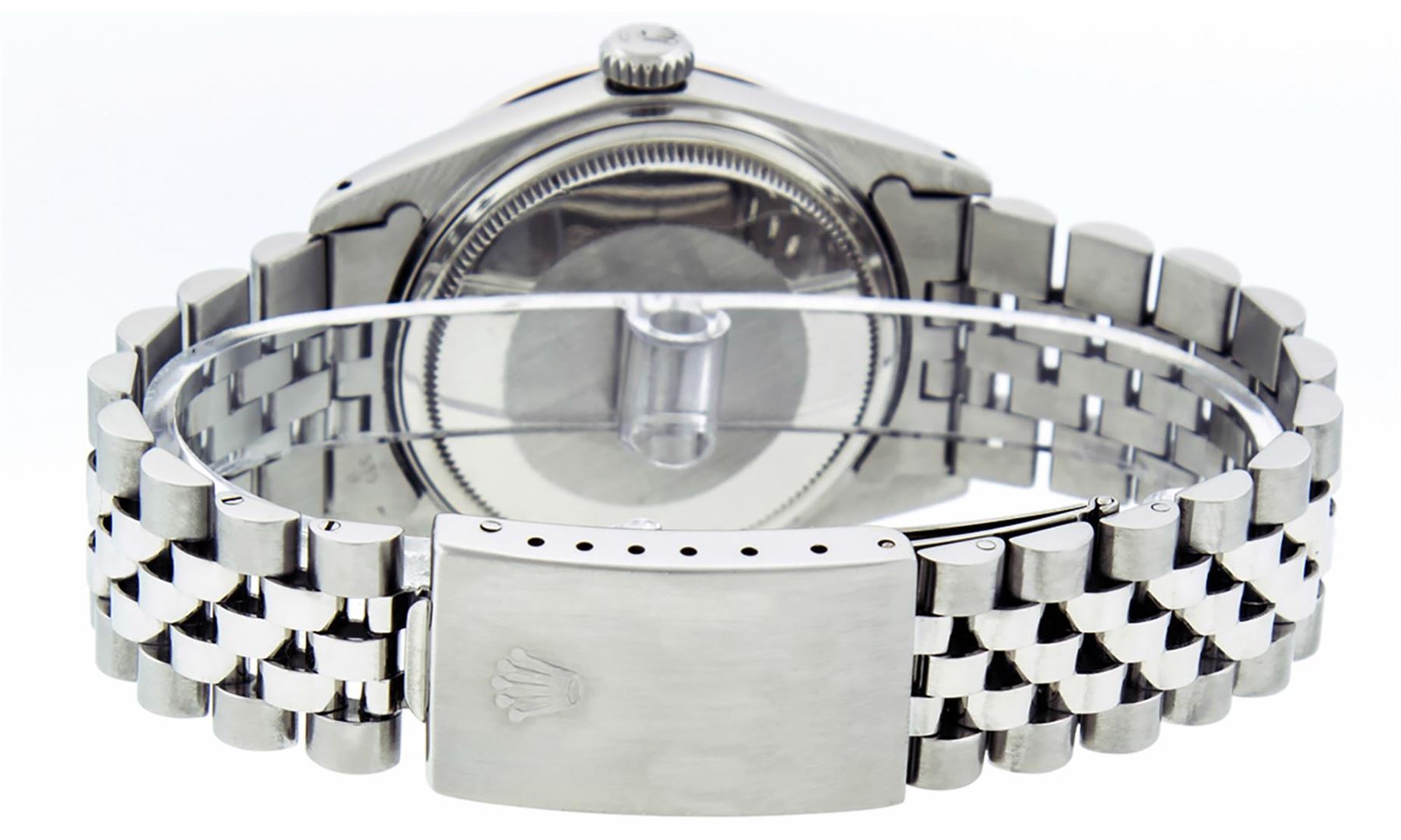 One Men's Stainless Steel Rolex Datejust Polished Bright with Satin Finish, This Watch Has Been Serviced & Electronically Tested, Stainless Steel Case: 36mm, Stainless Steel Crown, Bezel: 14K White Gold Fluted Bezel. Custom Crystal: New Acrylic Cyclops Lens. Custom Hands: New Luminescent Hands. Movement: Automatic Winding Movement Caliber 3035. Custom Dial: Silver Diamond Dial With Diamond Hour Markers, Diamond Count: 10 Diamonds in Dial G To H In Color, SI-VS Clarity. Date Window: 3 O'clock Position Date Display, Quickset, Model: Datejust, Condition: G-6 Extra Fine. Bracelet: Stainless Steel Jubilee. Bright Polish & Satin Finish. 7.0 Inch Length, Adjustable. Standard Clasp, With Rolex Logo. This Watch Has Been Serviced Time Tested And Is In Excellent Condition It Is Free Of All Scratches And Dents