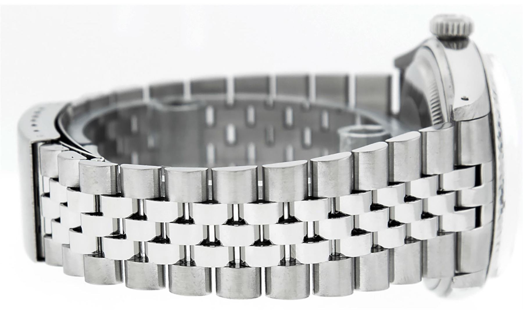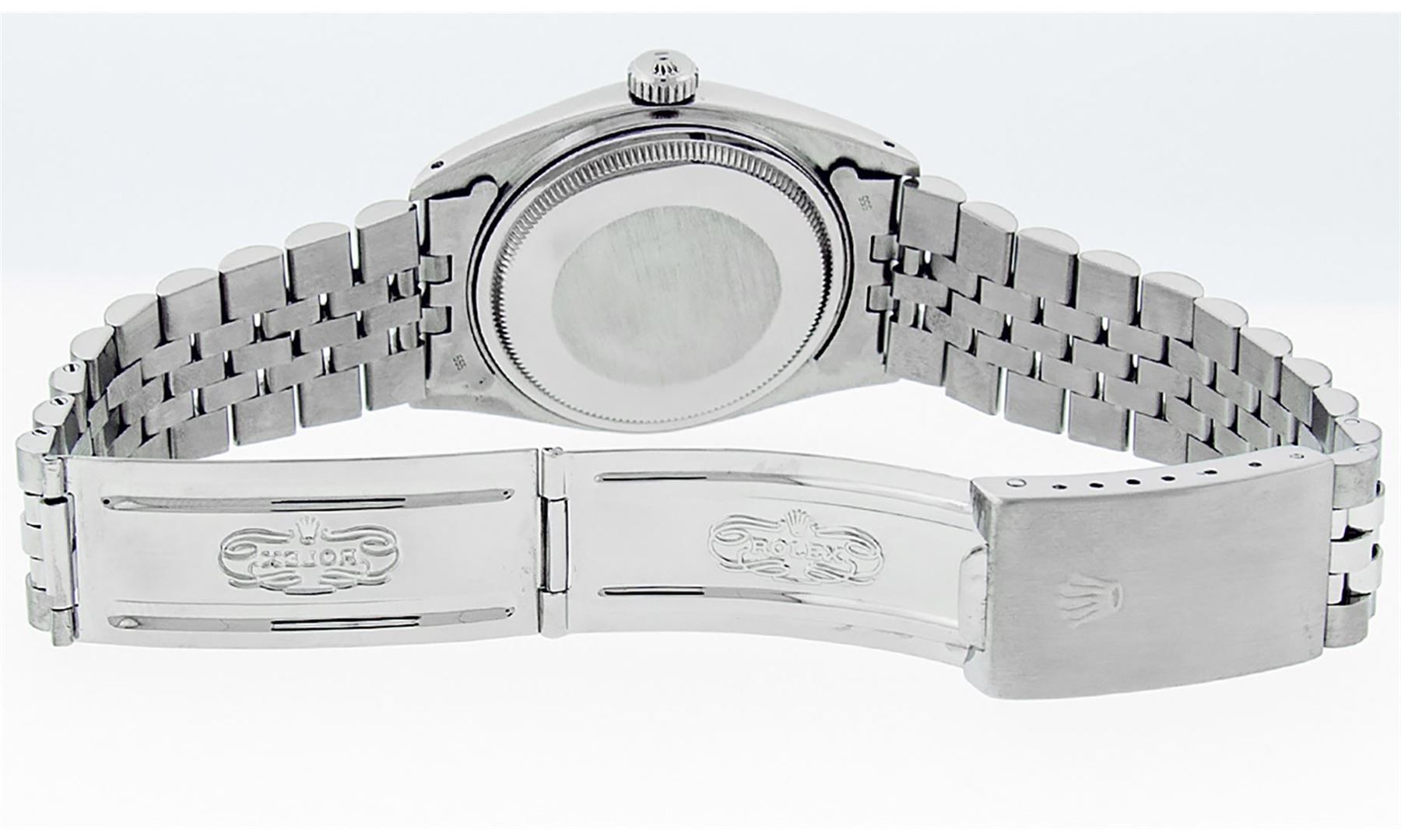 One Men's Stainless Steel Rolex Datejust Polished Bright with Satin Finish, This Watch Has Been Serviced & Electronically Tested, Stainless Steel Case: 36mm, Stainless Steel Crown, Bezel: White Gold Fluted Bezel. Custom Crystal: New Acrylic Cyclops Lens. Custom Hands: New Luminescent Hands. Movement: Automatic Winding Movement.. Custom Dial: Silver Diamond Dial With Diamond Hour Markers, Diamond Count: 10 Diamonds in Dial G To H In Color, SI-VS Clarity. Date Window: 3 O'clock Position Date Display, Quickset, Model: Datejust, Condition: G-6 Extra Fine. Bracelet: Stainless Steel Jubilee. Bright Polish & Satin Finish. 7.0 Inch Length, Adjustable. Standard Clasp, With Rolex Logo. This Watch Has Been Serviced Time Tested And Is In Excellent Condition It Is Free Of All Scratches And Dents