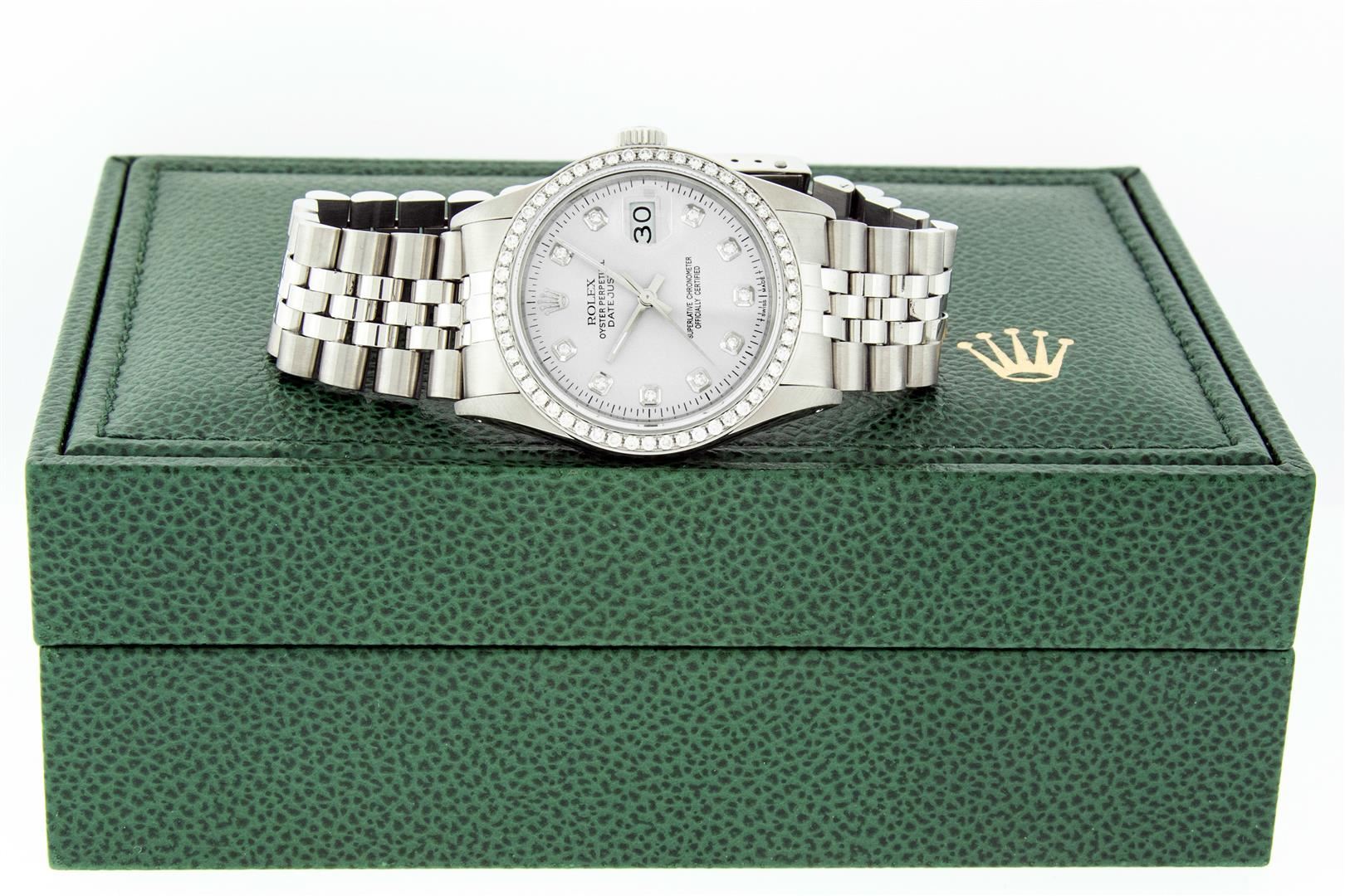 One Men's Rolex Stainless Steel Datejust Polished Bright with Satin Finish, This Watch Has Been Serviced & Electronically Tested, Stainless Steel Case: 36mm, Rolex Stainless Steel Crown, Custom Bezel: New Stainless Steel Beadset Diamond Bezel, Diamond Count: 54 Diamonds In Bezel, Total Weight 1.00 Carat, Clarity: SI-VS, Color: G to H. Custom Crystal: New Scratch Resistant Synthetic Sapphire Cyclops Lens. Custom Hands: New Luminescent Hands. Rolex Movement: Automatic Winding Movement. Custom Dial: Refinished To Silver Diamond Dial, Diamond Count: 10 Diamonds In Dial, Color: G to H, Clarity: VS2-SI1. Date Window: 3 O'clock Position Date Display, Quickset, Model: Datejust. Condition: G-6 Extra Fine. Rolex Bracelet: Stainless Steel Jubilee Band. Bright Polish & Satin Finish. 7.0 Inch Length, Adjustable. Standard Clasp, With Rolex Logo. This Pre Owned Watch Has Been Serviced Time Tested And Is In Excellent Condition It Is Free Of All Scratches And Dents. This Watch Comes With A Rolex Box.