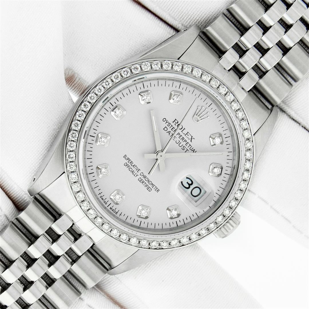 One Men's Rolex Stainless Steel Datejust Polished Bright with Satin Finish, This Watch Has Been Serviced & Electronically Tested, Stainless Steel Case: 36mm, Rolex Stainless Steel Crown, Custom Bezel: New Stainless Steel Beadset Diamond Bezel, Diamond Count: 54 Diamonds In Bezel, Total Weight 1.00 Carat, Clarity: SI-VS, Color: G to H. Custom Crystal: New Scratch Resistant Synthetic Sapphire Cyclops Lens. Custom Hands: New Luminescent Hands. Rolex Movement: Automatic Winding Movement. Custom Dial: Refinished To Silver Diamond Dial, Diamond Count: 10 Diamonds In Dial, Color: G to H, Clarity: VS2-SI1. Date Window: 3 O'clock Position Date Display, Quickset, Model: Datejust. Condition: G-6 Extra Fine. Rolex Bracelet: Stainless Steel Jubilee Band. Bright Polish & Satin Finish. 7.0 Inch Length, Adjustable. Standard Clasp, With Rolex Logo. This Pre Owned Watch Has Been Serviced Time Tested And Is In Excellent Condition It Is Free Of All Scratches And Dents. This Watch Comes With A Rolex Box.