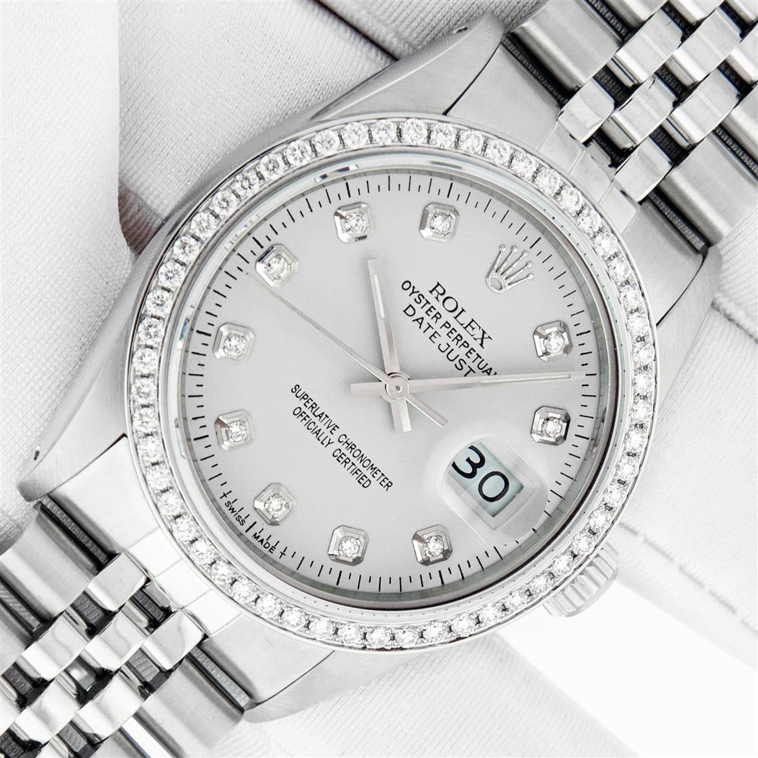 One Men's Rolex Stainless Steel Datejust Polished Bright with Satin Finish, This Watch Has Been Serviced & Electronically Tested, Stainless Steel Case: 36mm, Rolex Stainless Steel Crown, Custom Bezel: New Stainless Steel Beadset Diamond Bezel, Diamond Count: 54 Diamonds In Bezel, Total Weight 1.00 Carat, Clarity: SI-VS, Color: G to H. Custom Crystal: New Scratch Resistant Synthetic Sapphire Cyclops Lens. Custom Hands: New Luminescent Hands. Rolex Movement: Automatic Winding Movement. Custom Dial: Refinished To Silver Diamond Dial, Diamond Count: 10 Diamonds In Dial, Color: G to H, Clarity: VS2-SI1. Date Window: 3 O'clock Position Date Display, Quickset, Model: Datejust. Condition: G-6 Extra Fine. Rolex Bracelet: Stainless Steel Jubilee Band. Bright Polish & Satin Finish. 7.0 Inch Length, Adjustable. Standard Clasp, With Rolex Logo. This Pre Owned Watch Has Been Serviced Time Tested And Is In Excellent Condition It Is Free Of All Scratches And Dents. This Watch Comes With A Rolex Box.
