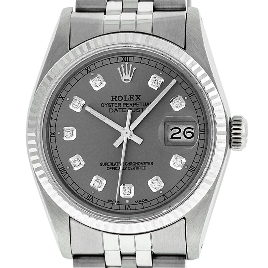One Men's Stainless Steel Rolex Datejust Polished Bright with Satin Finish, This Watch Has Been Serviced & Electronically Tested, Stainless Steel Case: 36mm, Stainless Steel Crown, Bezel: 14K White Gold Fluted Bezel. Custom Crystal: New Acrylic Cyclops Lens. Custom Hands: New Luminescent Hands. Movement: Automatic Winding Movement Caliber 3035. Custom Dial: Slate Grey Diamond Dial With Diamond Hour Markers And Roman Track, Diamond Count: 10 Diamonds in Dial G To H In Color, SI-VS Clarity. Date Window: 3 O'clock Position Date Display, Quickset, Model: Datejust, Condition: G-6 Extra Fine. Bracelet: Stainless Steel Jubilee. Bright Polish & Satin Finish. 7.0 Inch Length, Adjustable. Standard Clasp, With Rolex Logo. This Watch Has Been Serviced Time Tested And Is In Excellent Condition It Is Free Of All Scratches And Dents