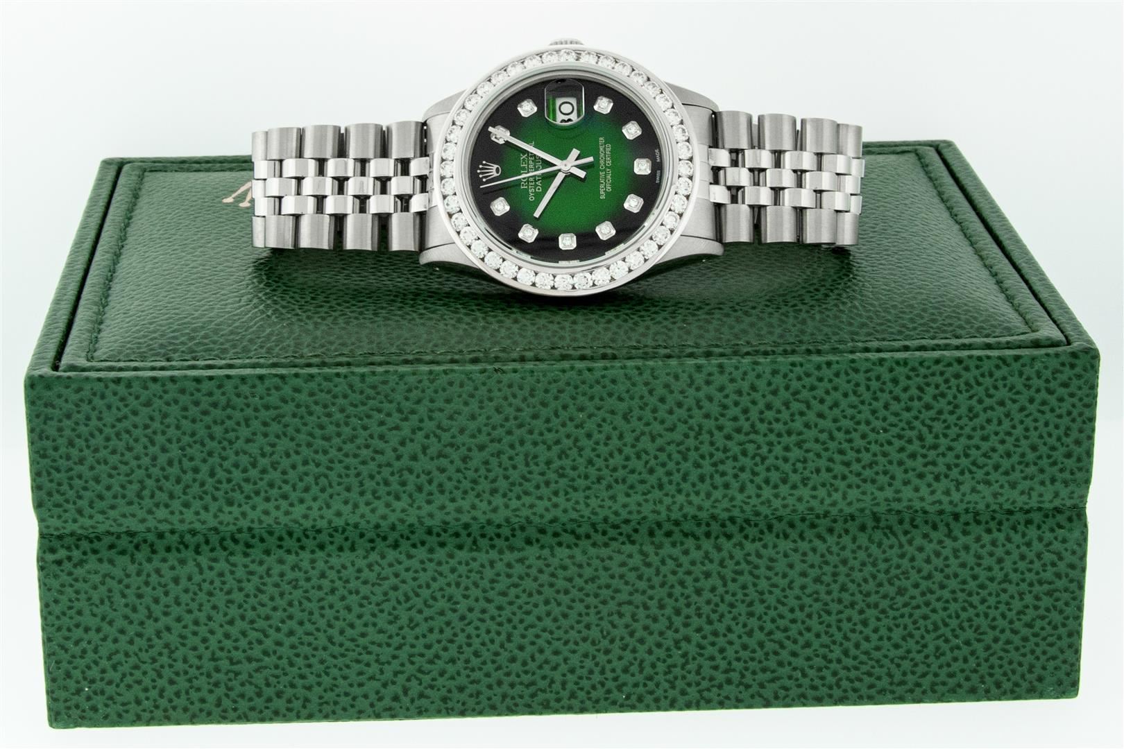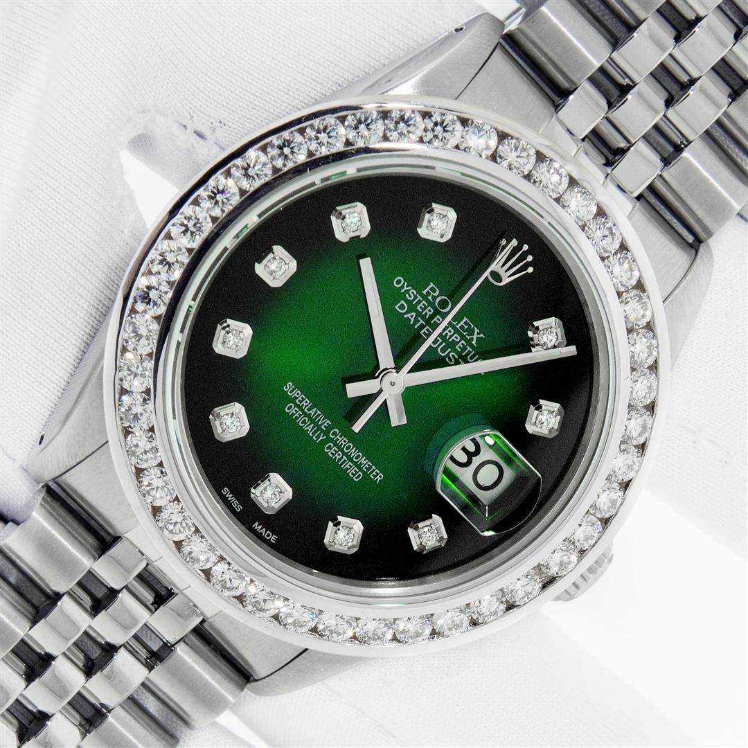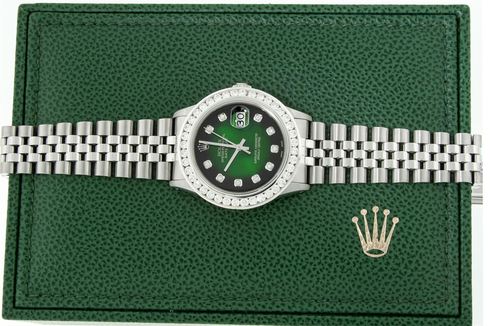 One Men's Stainless Steel Rolex Datejust Polished Bright with Satin Finish, Fully Serviced & Electronically Tested, Stainless Steel Case: 36mm, Rolex Stainless Steel Crown, Custom Bezel: New 18K White Gold 3.00 Ctw Diamond Bezel, Diamond Count: 40 Diamonds, Total Weight 3.0 Carat, Clarity: SI-VS, Color: G to H. Custom Crystal: New Sapphire with Magnified Date Window. Custom Hands: New Luminescent Hands. Rolex Movement: Automatic Winding Movement. Custom Dial: Refinished To Green Vignette with Added Diamond Hour Markers, 10 Diamonds in Dial, G To H In Color, Clarity: SI-VS. Date Window: 3 O'Clock Position Date Display, Quickset, Model: Datejust 36mm, Condition: G-6 Extra Fine. Rolex Bracelet: Rolex Stainless Steel Jubilee Band. Bright Polish & Satin Finish. 7.0 Inch Length, Adjustable. Standard Clasp, with Rolex Logo. This Pre Owned Watch Has Been Serviced And Polished It Is Free Of All Scratches And Dents.