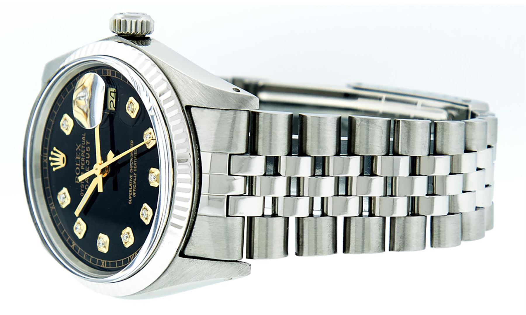 One Men's Stainless Steel Rolex Datejust Polished, Serviced & Electronically Tested, Stainless Steel Case: 36mm, Stainless Steel Crown, Original Bezel: White Gold Fluted Bezel. Custom Crystal: New Acrylic Cyclops Lens. Custom Hands: New Luminescent Hands. Movement: Automatic Winding Movement. Caliber. Custom Dial: Black Diamond Dial With Track, Diamond Count: 10 Diamonds, Clarity: SI-VS, Color: G to H. Date Window: 3 O'clock Position Date Display, Quickset, Model: Datejust. Condition: G-6 Extra Fine. Bracelet: Stainless Steel Jubilee. Bright Polish & Satin Finish. 7.0 Inch Length, Adjustable. Standard Clasp, With Rolex Logo. This Watch Has Been Serviced Time Tested And Is In Excellent Condition It Is Free Of All Scratches And Dents