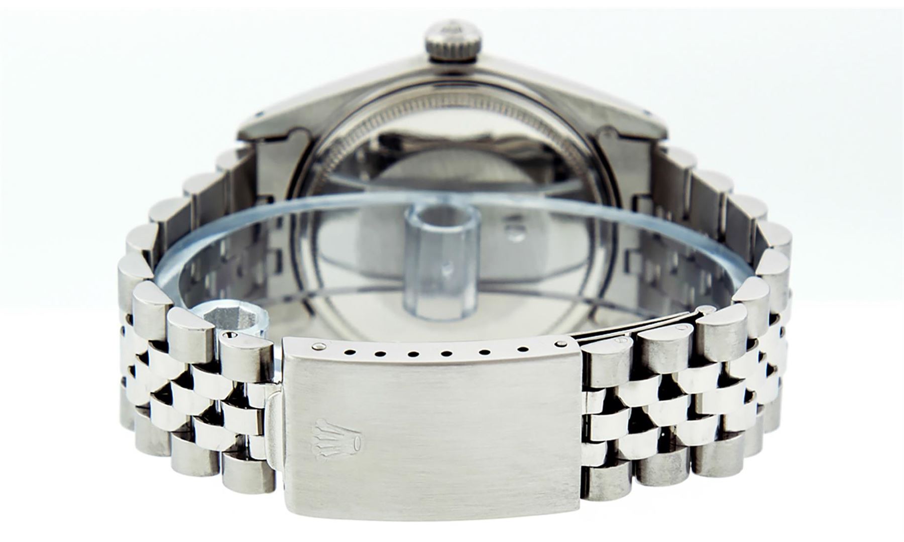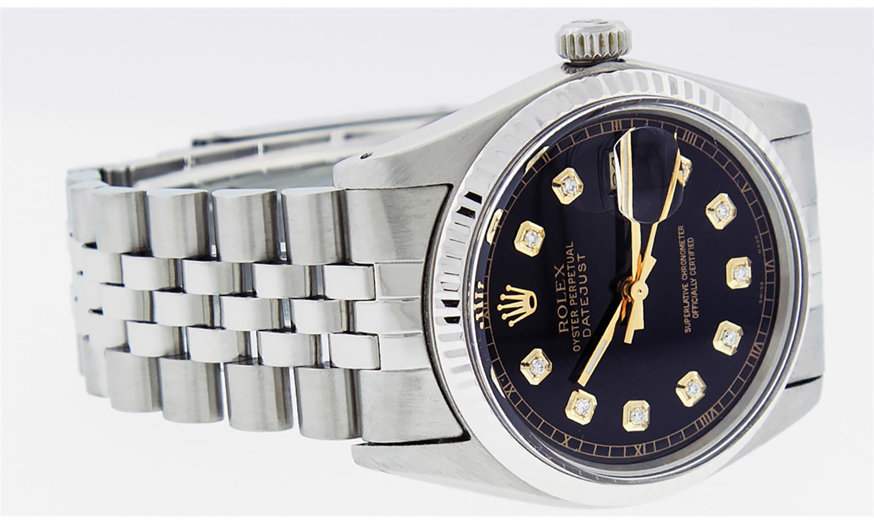 One Men's Stainless Steel Rolex Datejust Polished, Serviced & Electronically Tested, Stainless Steel Case: 36mm, Stainless Steel Crown, Original Bezel: White Gold Fluted Bezel. Custom Crystal: New Acrylic Cyclops Lens. Custom Hands: New Luminescent Hands. Movement: Automatic Winding Movement. Caliber. Custom Dial: Black Diamond Dial With Track, Diamond Count: 10 Diamonds, Clarity: SI-VS, Color: G to H. Date Window: 3 O'clock Position Date Display, Quickset, Model: Datejust. Condition: G-6 Extra Fine. Bracelet: Stainless Steel Jubilee. Bright Polish & Satin Finish. 7.0 Inch Length, Adjustable. Standard Clasp, With Rolex Logo. This Watch Has Been Serviced Time Tested And Is In Excellent Condition It Is Free Of All Scratches And Dents