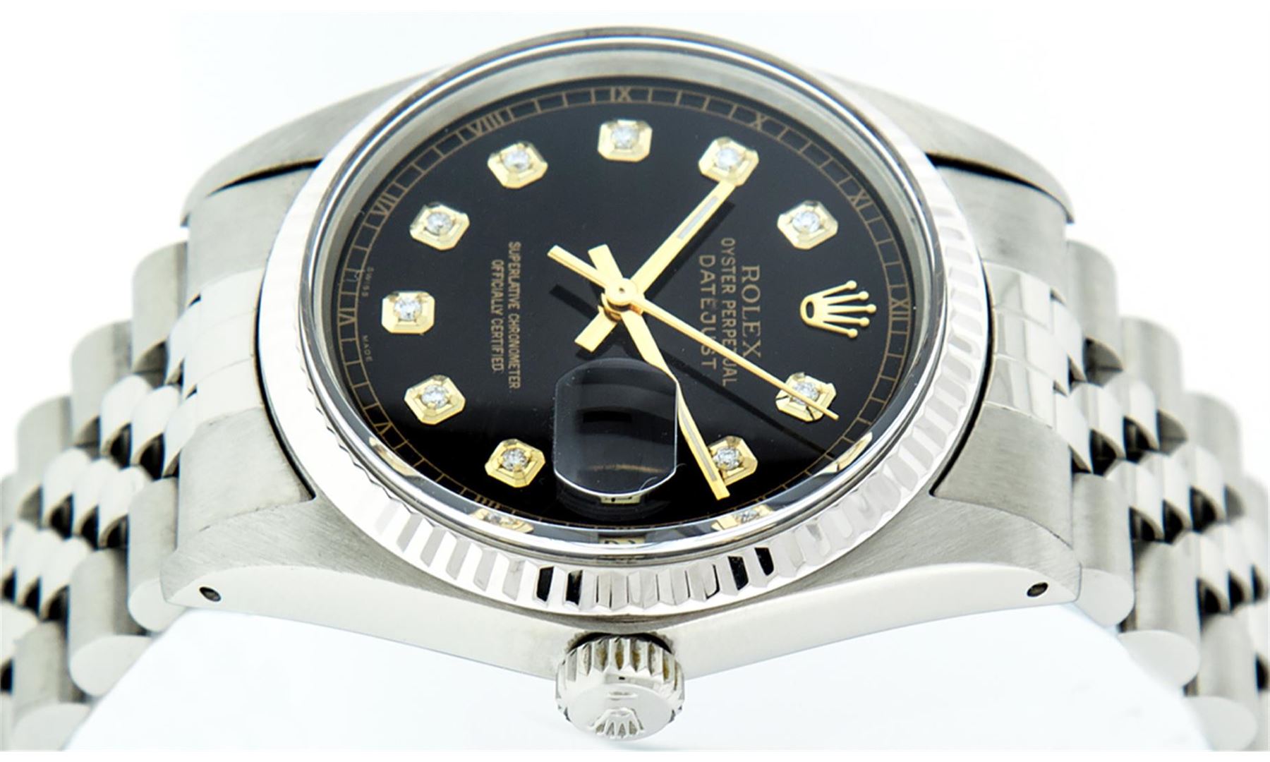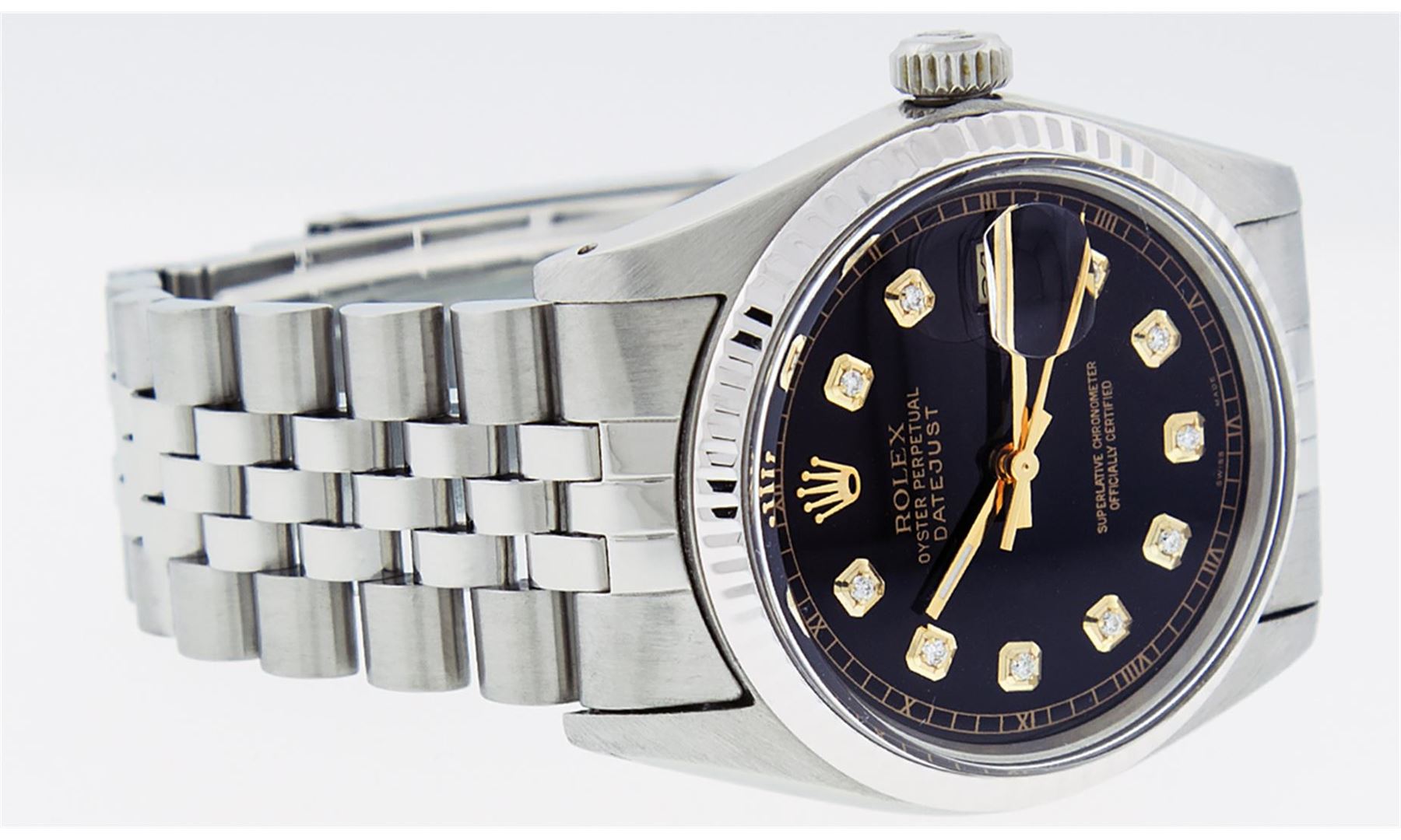One Men's Stainless Steel Rolex Datejust Polished, Serviced & Electronically Tested, Stainless Steel Case: 36mm, Stainless Steel Crown, Original Bezel: 14K White Gold Fluted Bezel. Custom Crystal: New Acrylic Cyclops Lens. Custom Hands: New Luminescent Ha