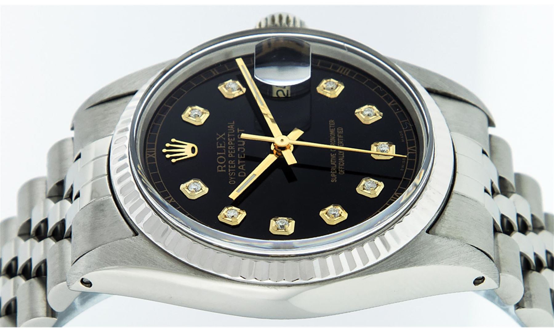 One Men's Stainless Steel Rolex Datejust Polished, Serviced & Electronically Tested, Stainless Steel Case: 36mm, Stainless Steel Crown, Original Bezel: 14K White Gold Fluted Bezel. Custom Crystal: New Acrylic Cyclops Lens. Custom Hands: New Luminescent Ha