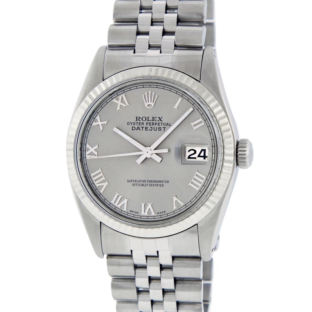 One Men's Stainless Steel Rolex Datejust Polished, Serviced & Electronically Tested, Stainless Steel Case: 36mm, Stainless Steel Crown, Bezel: 14K White Gold Fluted Bezel. Custom Crystal: New Acrylic Cyclops Lens. Custom Hands: New Luminescent Hands. Movement: Automatic Winding Movement Caliber 3035. Custom Dial: Slate Grey Roman With Square Track. Date Window: 3 O'Clock Position Date Display, Quickset, Model: Datejust, Condition: G-6 Extra Fine. Bracelet: Stainless Steel Jubilee. Bright Polish & Satin Finish. 7.0 Inch Length, Adjustable. Standard Clasp, With Rolex Logo. This Watch Has Been Serviced Time Tested And Is In Excellent Condition It Is Free Of All Scratches And Dents