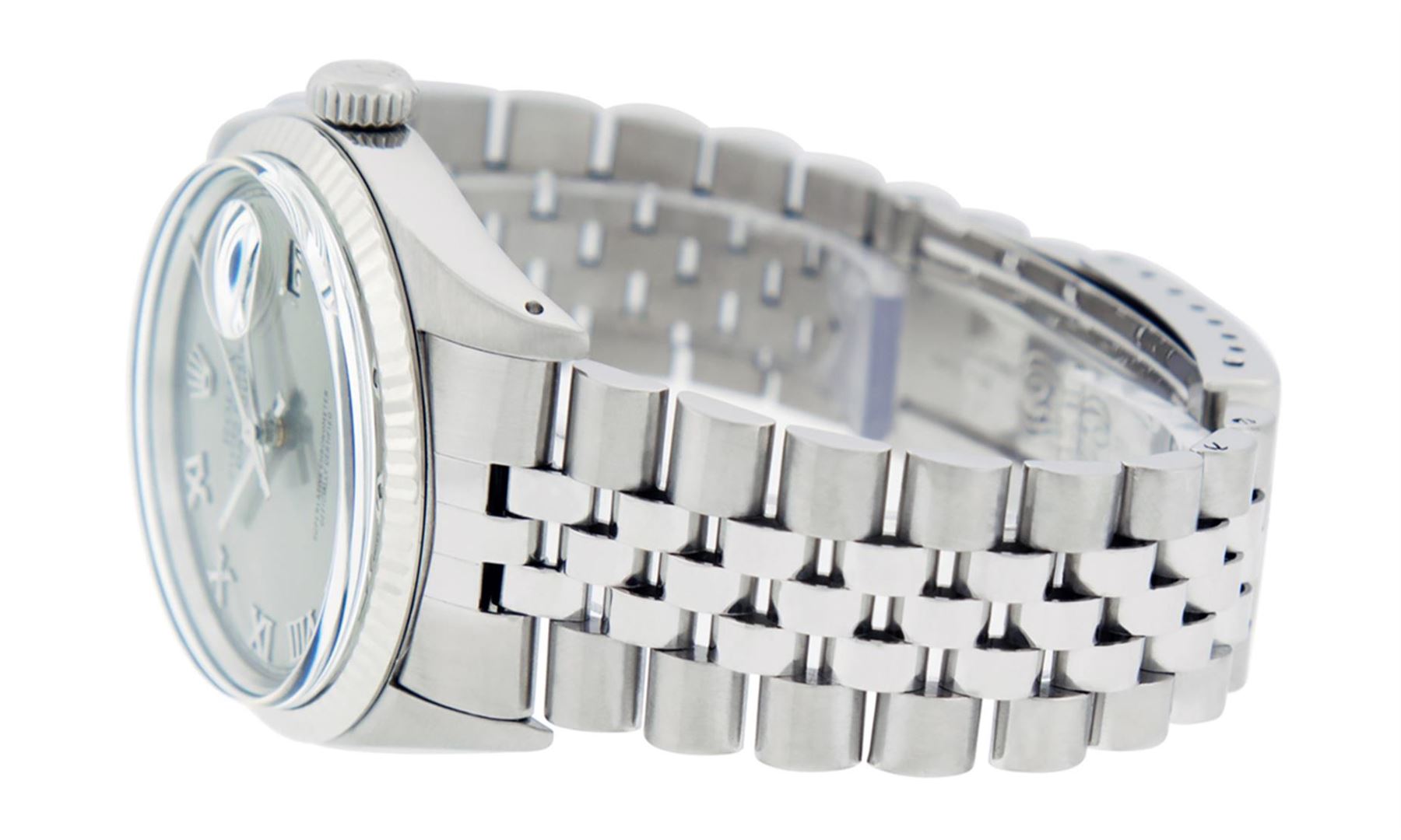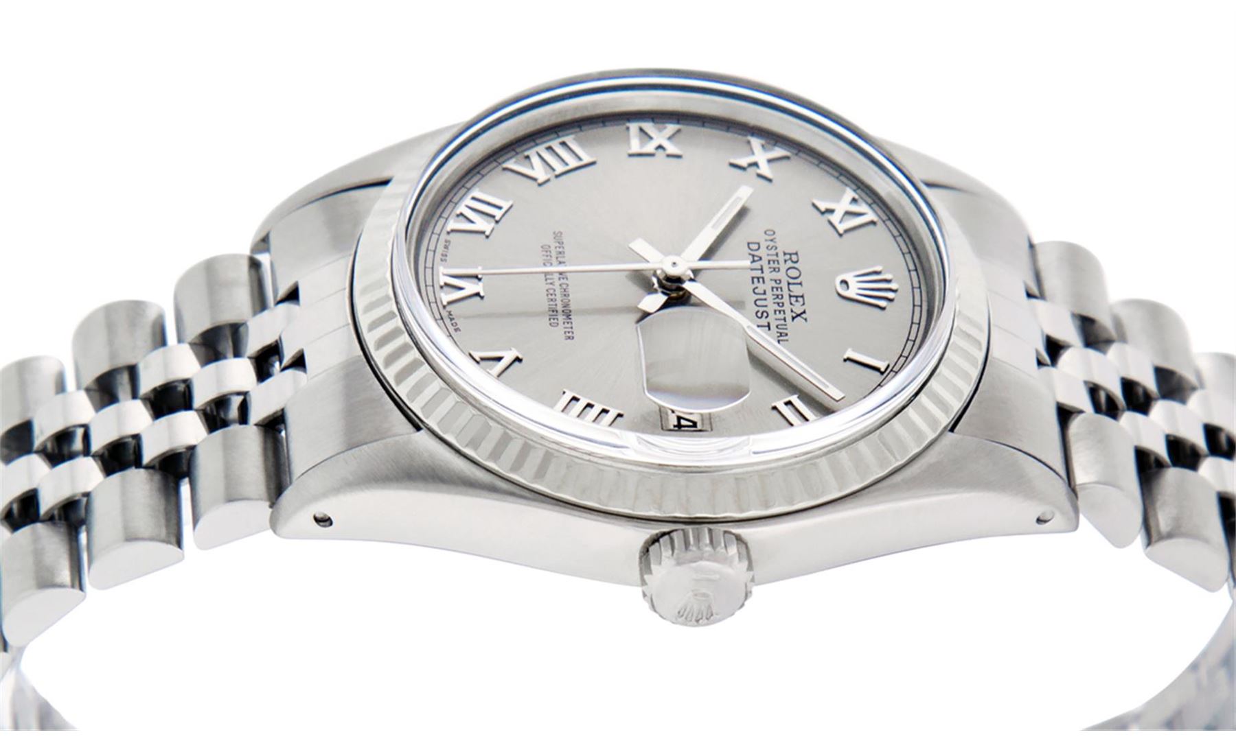 One Men's Stainless Steel Rolex Datejust Polished, Serviced & Electronically Tested, Stainless Steel Case: 36mm, Stainless Steel Crown, Bezel: 14K White Gold Fluted Bezel. Custom Crystal: New Acrylic Cyclops Lens. Custom Hands: New Luminescent Hands. Movement: Automatic Winding Movement Caliber 3035. Custom Dial: Slate Grey Roman With Square Track. Date Window: 3 O'Clock Position Date Display, Quickset, Model: Datejust, Condition: G-6 Extra Fine. Bracelet: Stainless Steel Jubilee. Bright Polish & Satin Finish. 7.0 Inch Length, Adjustable. Standard Clasp, With Rolex Logo. This Watch Has Been Serviced Time Tested And Is In Excellent Condition It Is Free Of All Scratches And Dents
