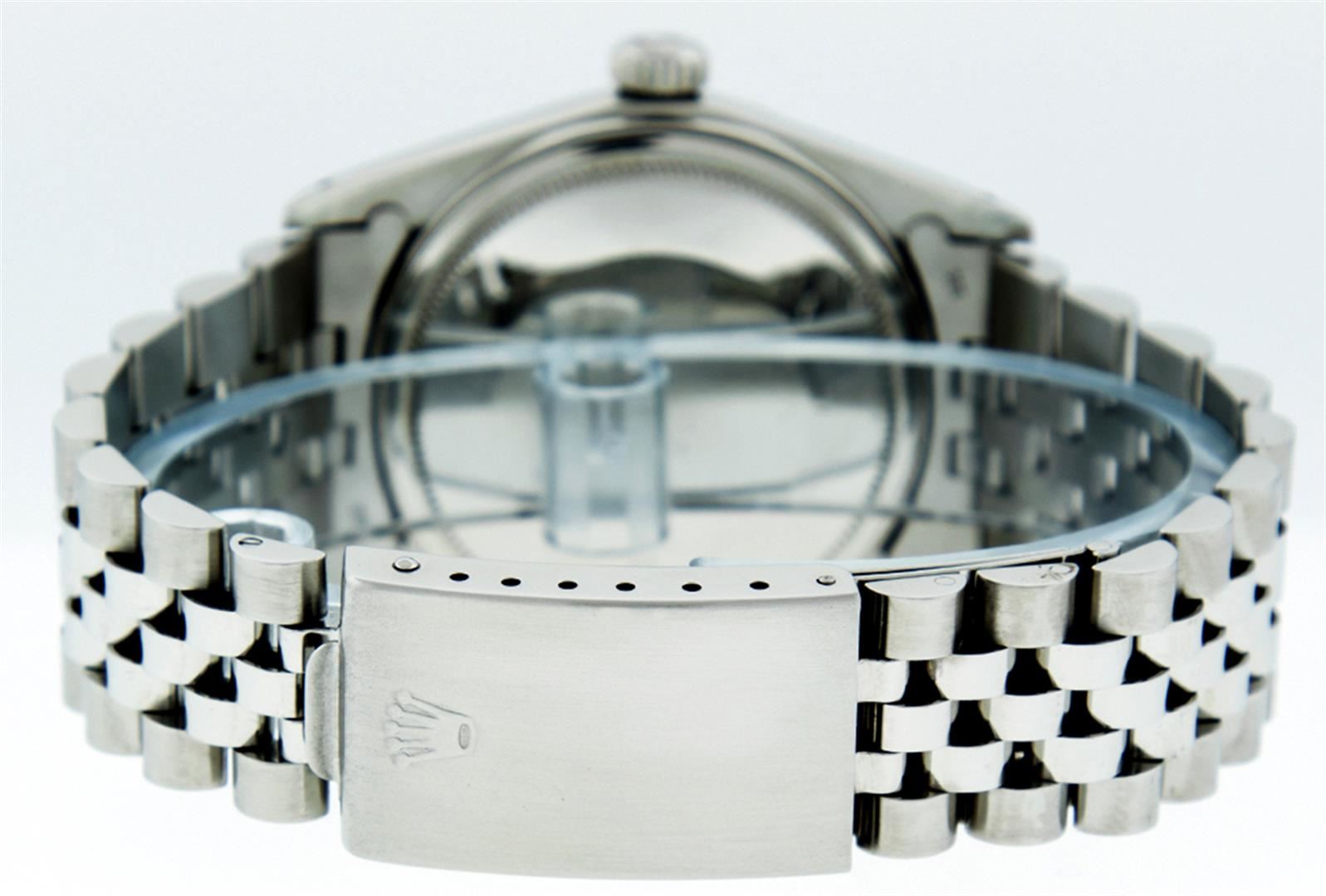 One Mens Rolex Datejust Polished Bright with Satin Finish, Serviced & Electronically Tested, Stainless Steel Case: 36mm, Stainless Steel Crown, Bezel: 14K White Gold Fluted Bezel. Custom Crystal: New Acrylic Cyclops Lens. Custom Hands: New Luminescent Hands. Movement: Automatic Winding Movement Caliber 3035. Custom Dial: Black Baguette Diamond 8 + 2 Synthetic Emerald Dial, Stone Count: 8 Baguette Diamonds in Dial + 2 Synthetic Emerald Baguettes, G To H In Color, Si-VS Clarity. Date Window: 3 O'Clock Position Date Display, Quickset, Model: Datejust, Condition: G-6 Extra Fine. Bracelet: Stainless Steel Jubilee. Bright Polish & Satin Finish. 7.0 Inch Length, Adjustable. Standard Clasp, With Rolex Logo. Watch Has Been Serviced And Polished It Is Free Of All Scratches And Dents.