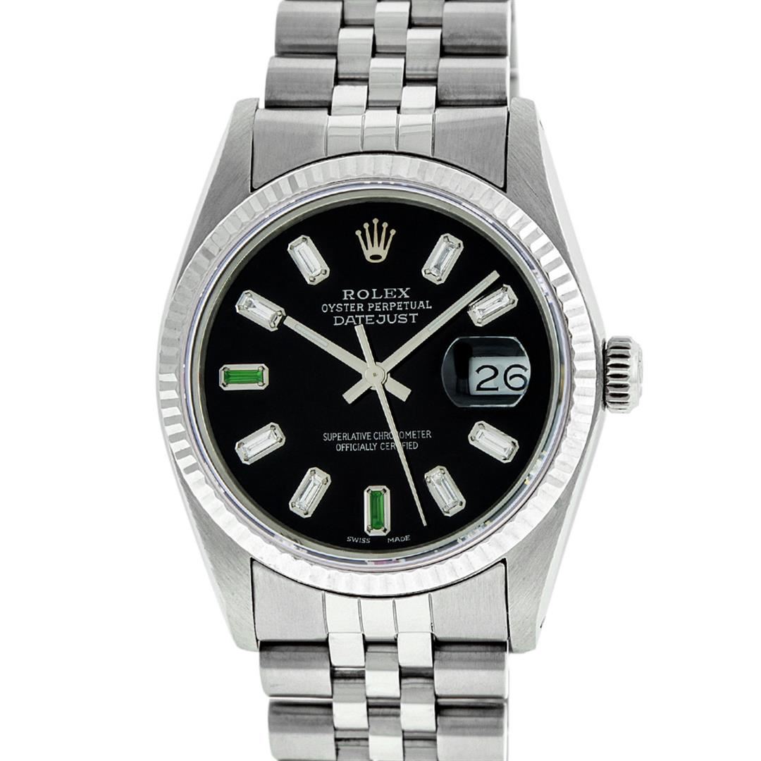 One Mens Rolex Datejust Polished Bright with Satin Finish, Serviced & Electronically Tested, Stainless Steel Case: 36mm, Stainless Steel Crown, Bezel: 14K White Gold Fluted Bezel. Custom Crystal: New Acrylic Cyclops Lens. Custom Hands: New Luminescent Hands. Movement: Automatic Winding Movement Caliber 3035. Custom Dial: Black Baguette Diamond 8 + 2 Synthetic Emerald Dial, Stone Count: 8 Baguette Diamonds in Dial + 2 Synthetic Emerald Baguettes, G To H In Color, Si-VS Clarity. Date Window: 3 O'Clock Position Date Display, Quickset, Model: Datejust, Condition: G-6 Extra Fine. Bracelet: Stainless Steel Jubilee. Bright Polish & Satin Finish. 7.0 Inch Length, Adjustable. Standard Clasp, With Rolex Logo. Watch Has Been Serviced And Polished It Is Free Of All Scratches And Dents.